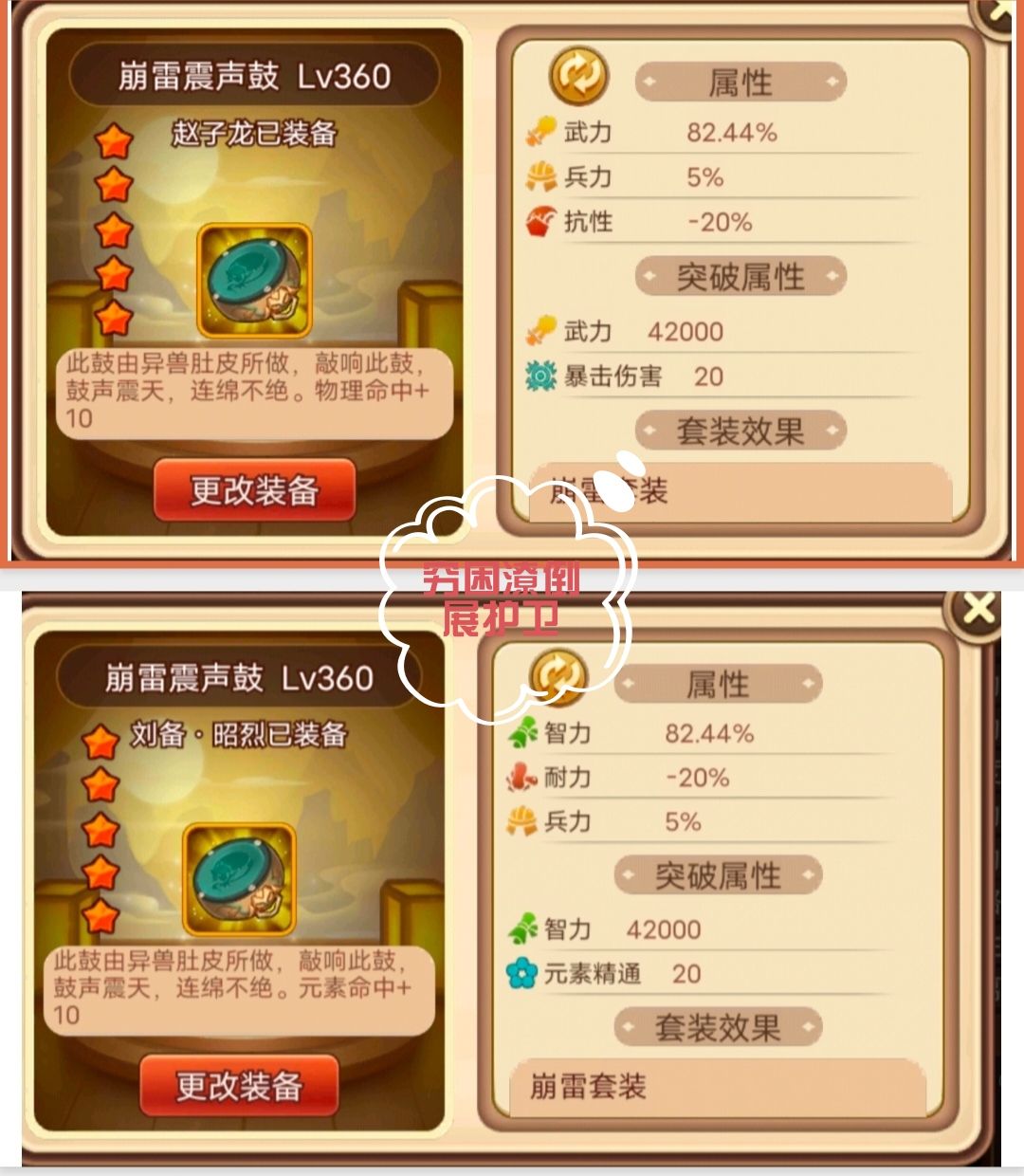 2,崩雷震声鼓,82.44%武力/智力,10物理/元素命中;10星4.2万武力/智力、20爆伤/精通。命中属性对输出将较为重要;可选择突破至10星,突破10星需求的各类材料较大。