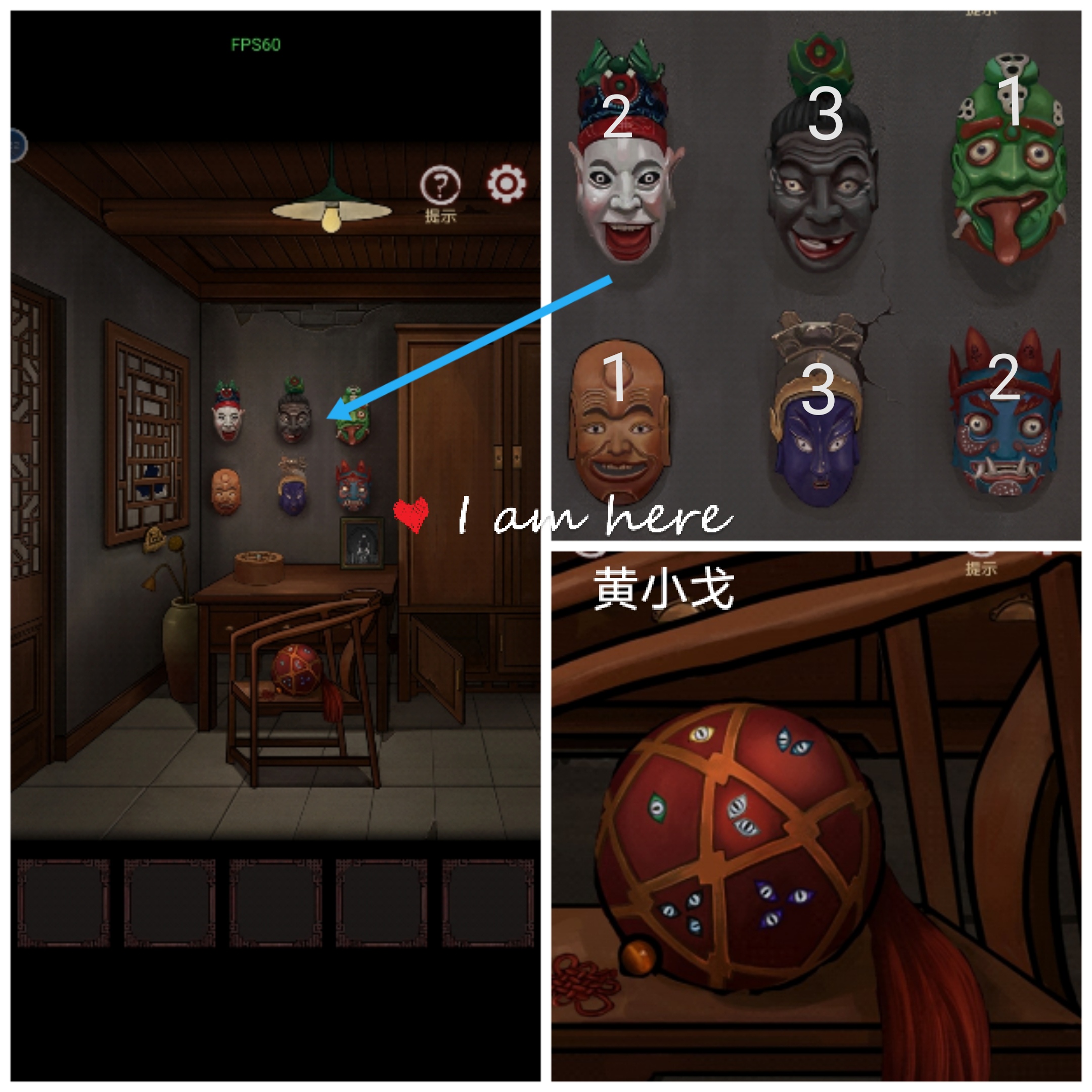 2.点击墙上的面具,根据球上的信息,点击面具(绿色1、黄色1、银色2、蓝色2、黑色3、紫色3),触发机关,物品掉落(注意看眼睛朝向)