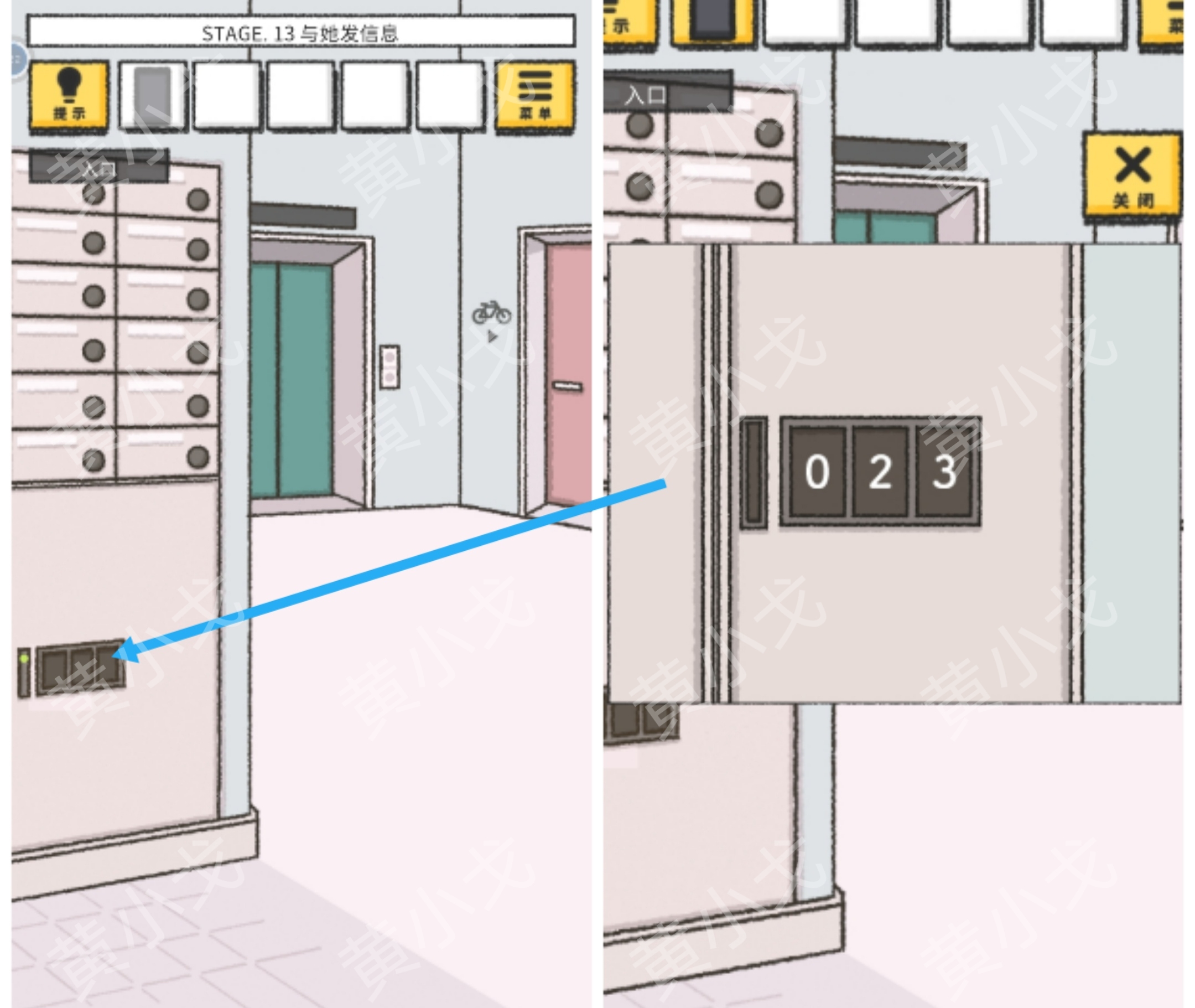 2.(大门)点击柜子上的盒子,根据【钥匙链】上的线索结合手机键盘,输入密码:14569(从1开始,在键盘上跟着箭头走)