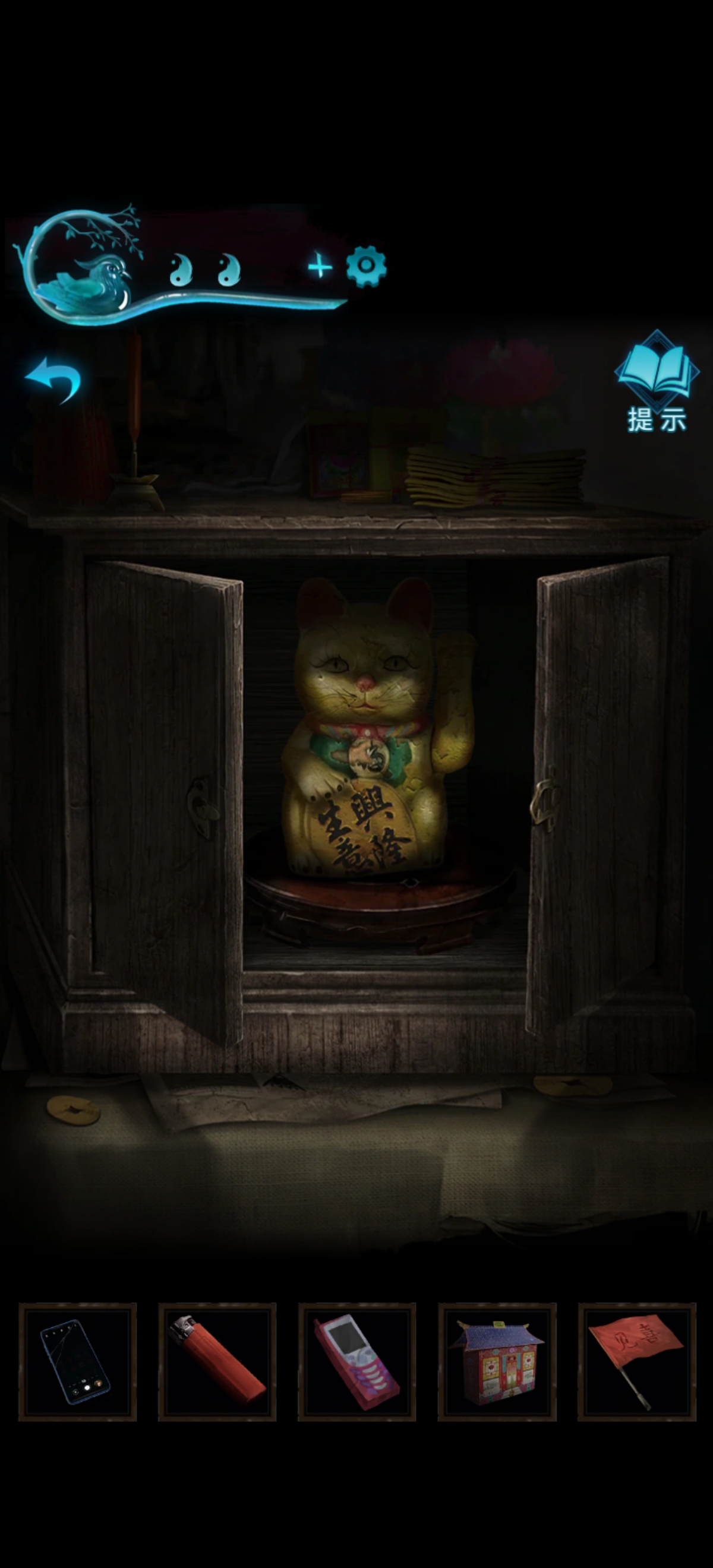 退出来就能看到屋里光源除了桌子上的灯就是旁边一个绿油油的小元宝了,拿走小元宝后回去把所有灯都打开,这下场景终于看起来好一些了。