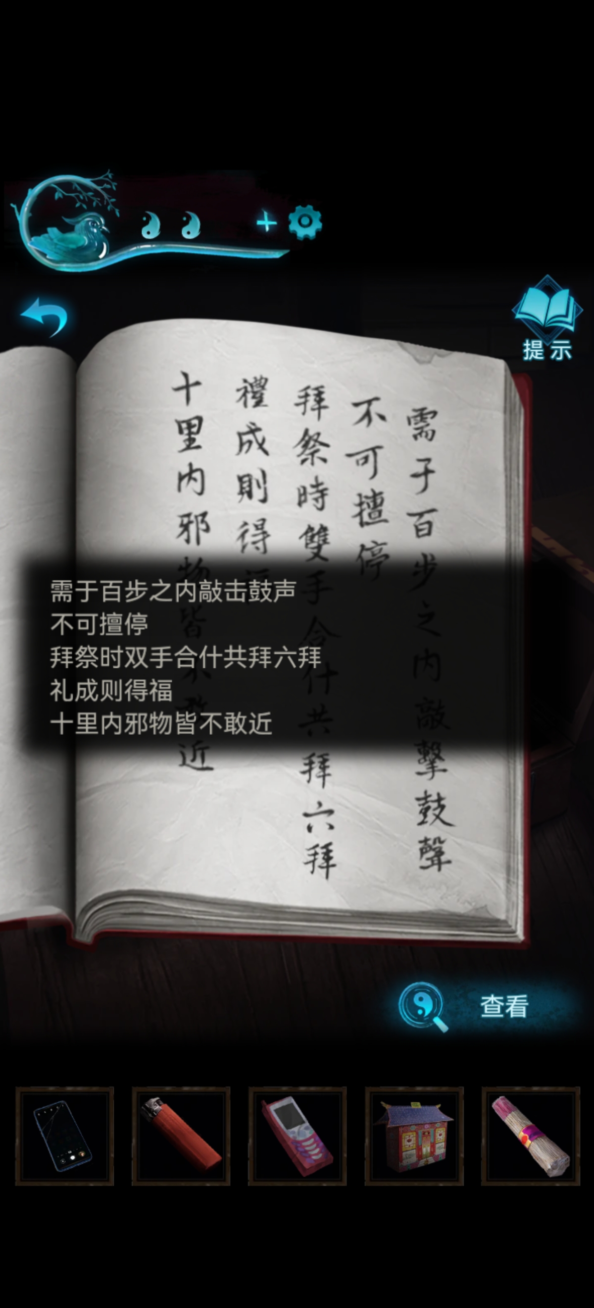查看旁边书籍小本本记一下铃铛=大凶、纸人=大吉、花轿=大凶、老树=中凶、纸钱=小吉、发簪=大凶、镜子=小凶、棺材=中吉。