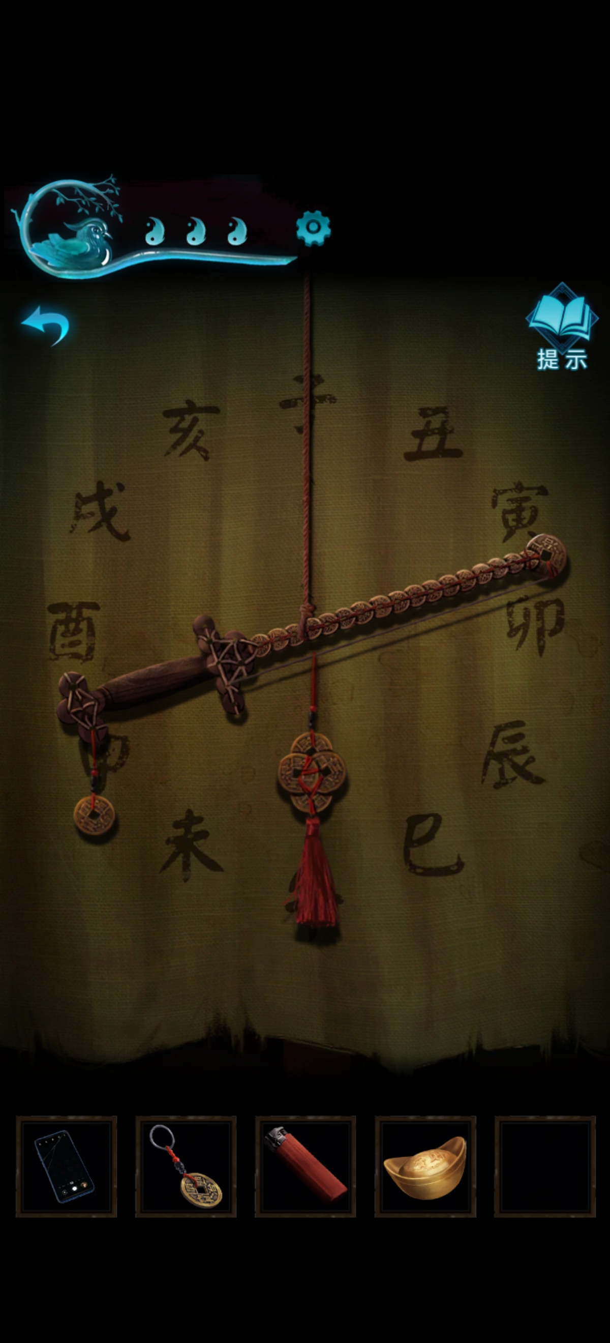 然后调查拿走小元宝的台子后面有一把铜钱穿起来的剑,把手里的小铜钱吊坠也给挂上就能玩小游戏了。因为前面书上说辰时财运旺,所以我们调整小铜钱串和大铜钱串位置,让剑尖指向辰时。调整好后旁边卷轴就会打开掉出一把小金鞭。