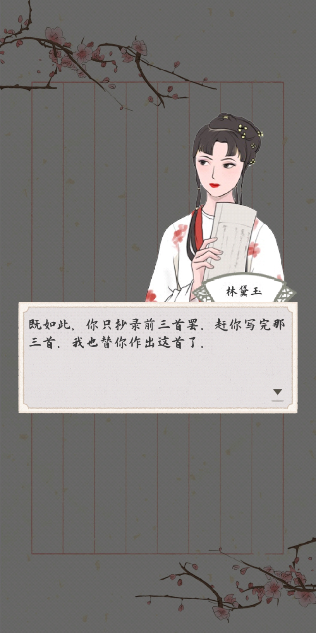 根据填入内容的正确率与速度,贵妃也将赐予你不同程度的称赞与奖赏;当然,若是你一筹莫展,也不要忘记找林妹妹帮上一把——在省亲事件中,也会触发原著中“杏帘在望”的剧情;