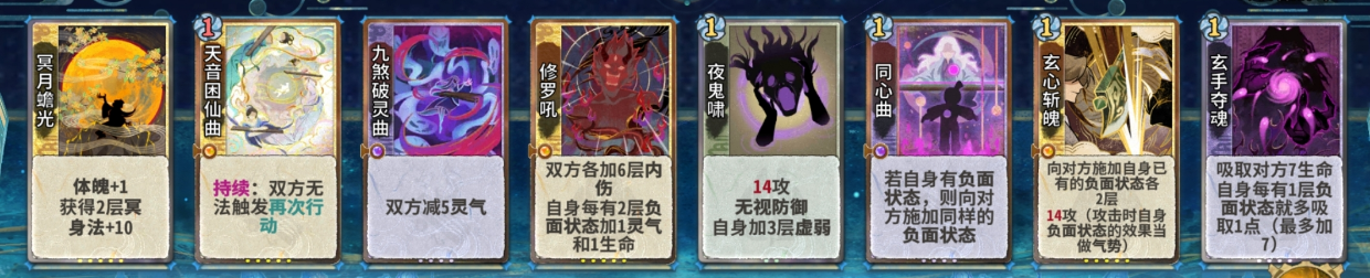 冥夜共鸣:卡组里持续卡只有冥夜时取消加攻上限,12轮后升级卡组前两张崩拳。也就用崩拳过渡有点收益。化神后也是用来打拳或者百杀的(那还不如玩丹田),对琴叶来说几乎没啥收益,不推荐选