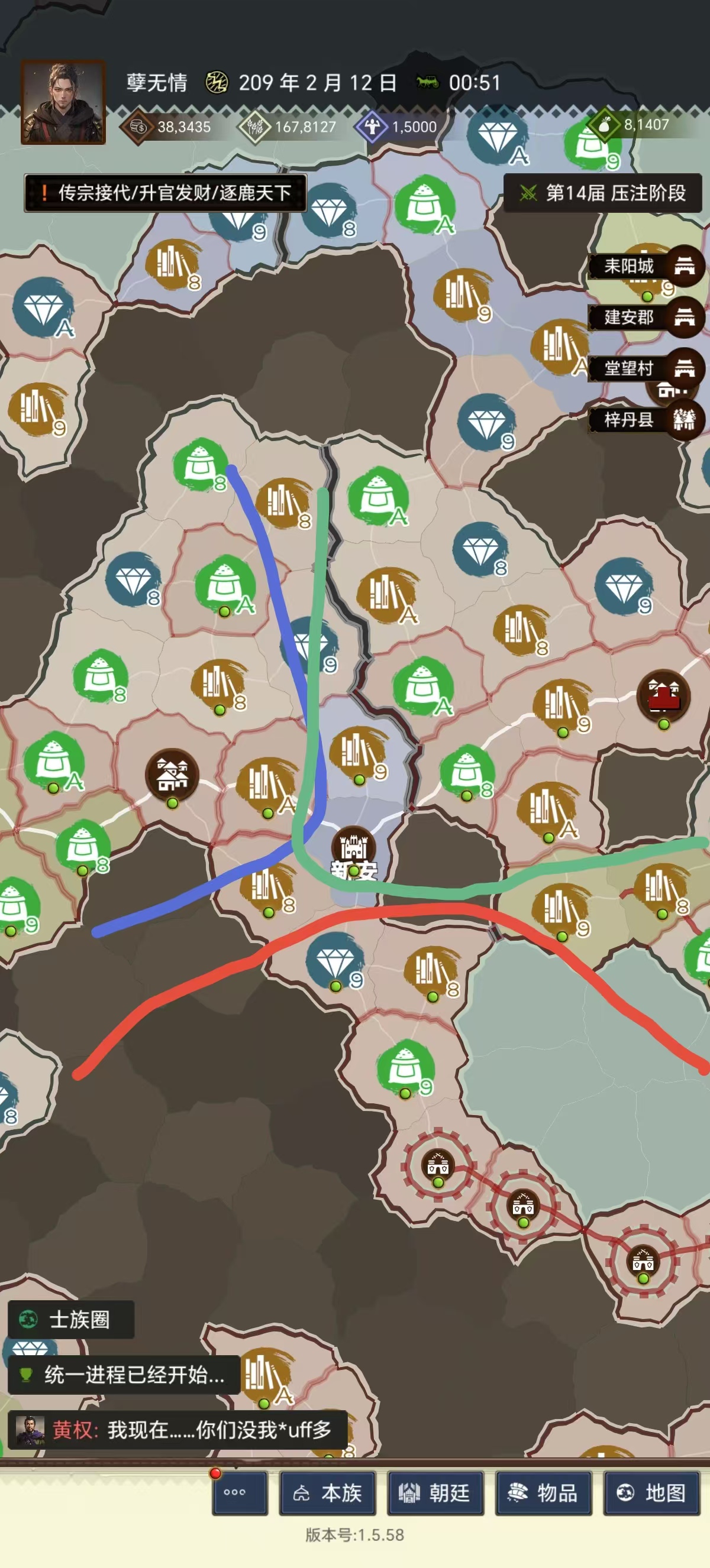 事已至此,毕竟决战需要一个团队的人齐心协力,不可能做到没有一丝差错,于是三方于新安继续对峙。由于快到过月,于是要齐在新安那边打个资源地秒要塞(大齐明明比商先到新安那么久,竟然新安附近资源地一个没打,要塞没法秒是我没想到的)并且那个时间段由于到中午,剑来帮忙控制队伍的人都走了,留下我一个既要控制剑来队伍下长安,又要规划新安部署和计算商到新安的时间以及齐的路线,以至于忘记提醒齐在商来之前把新安附近地打一下算是一个我的大失误。之后商主力部队在恢复了士气之后趁齐在打新安资源地准备起要塞的时间段,先手把新安城防兵打下,再战齐国部队。