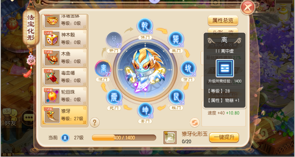 当少侠达到65级后,将会受到有缘人的指引,为法宝注入八卦之力,开启法宝化形功能。此后少侠们可对六个法宝的八卦进行升级培养,提升化形等级,获得高额的属性加成,在化形达到一定等级后,法宝还会化作人形哦~