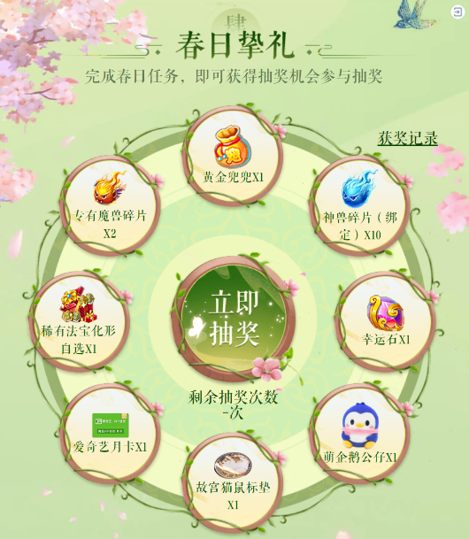 满足回归用户条件,且在3月22日至4月20日期间成功登录的少侠,每日首次登录本活动页面以及邀请一位回归好友均可获取1次抽奖机会,消耗抽奖机会即可参与抽奖,奖品丰富,欲“抽”从速~