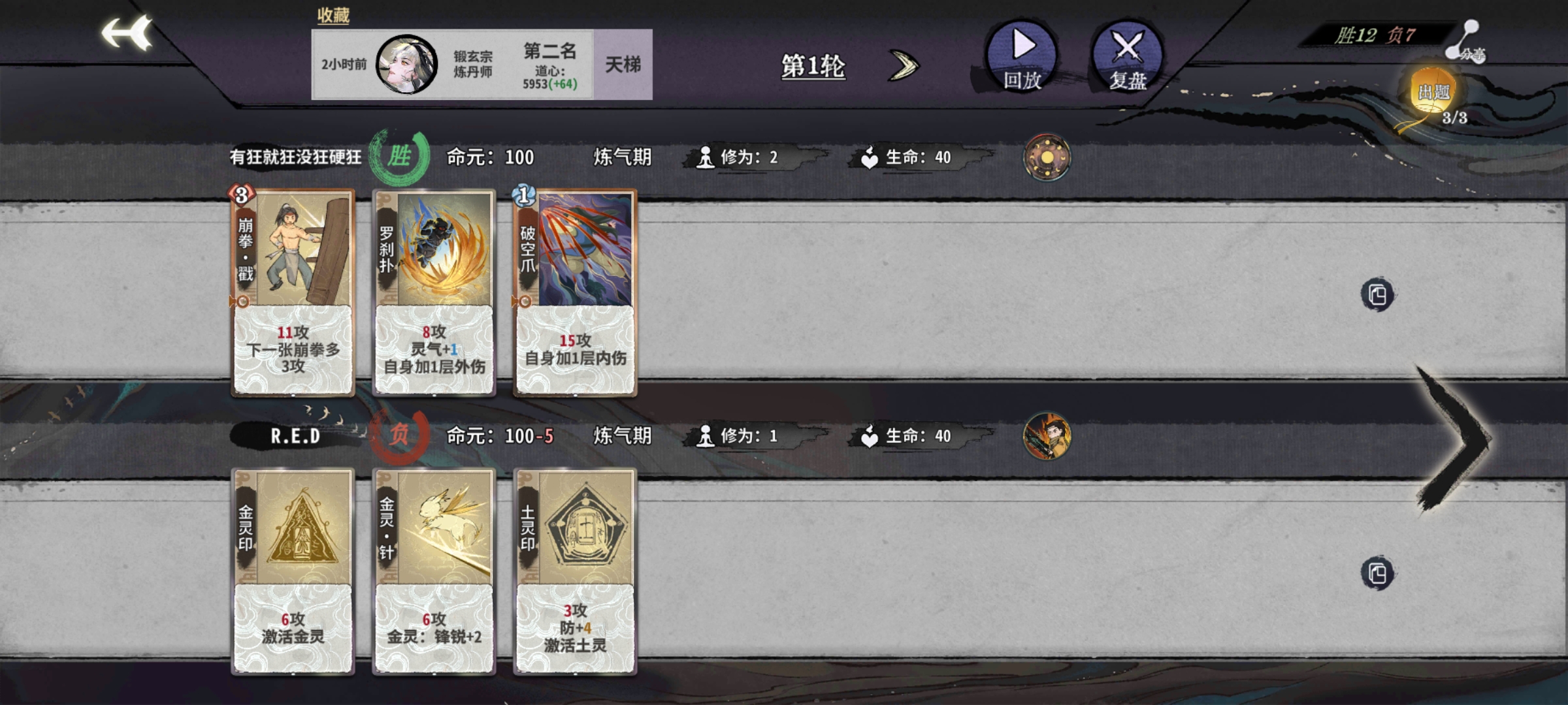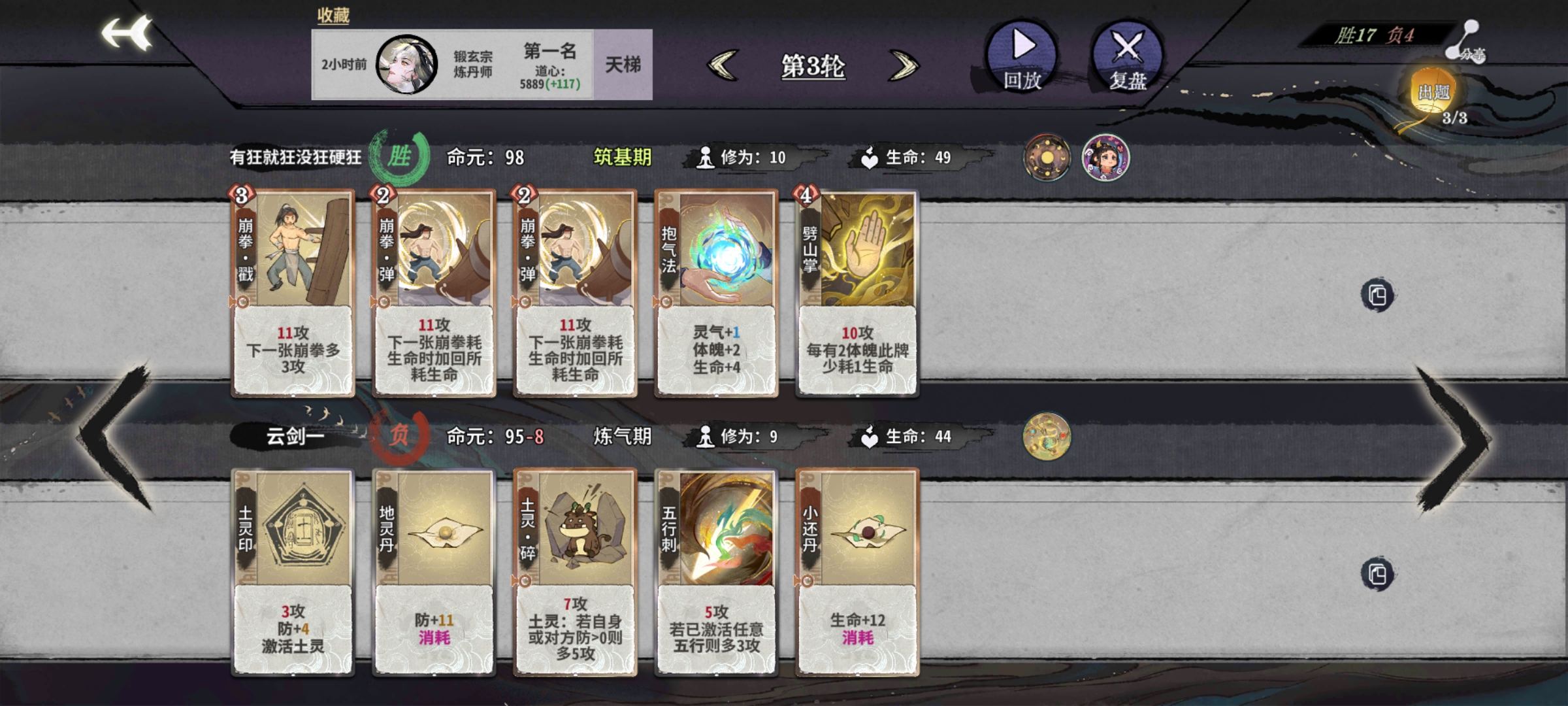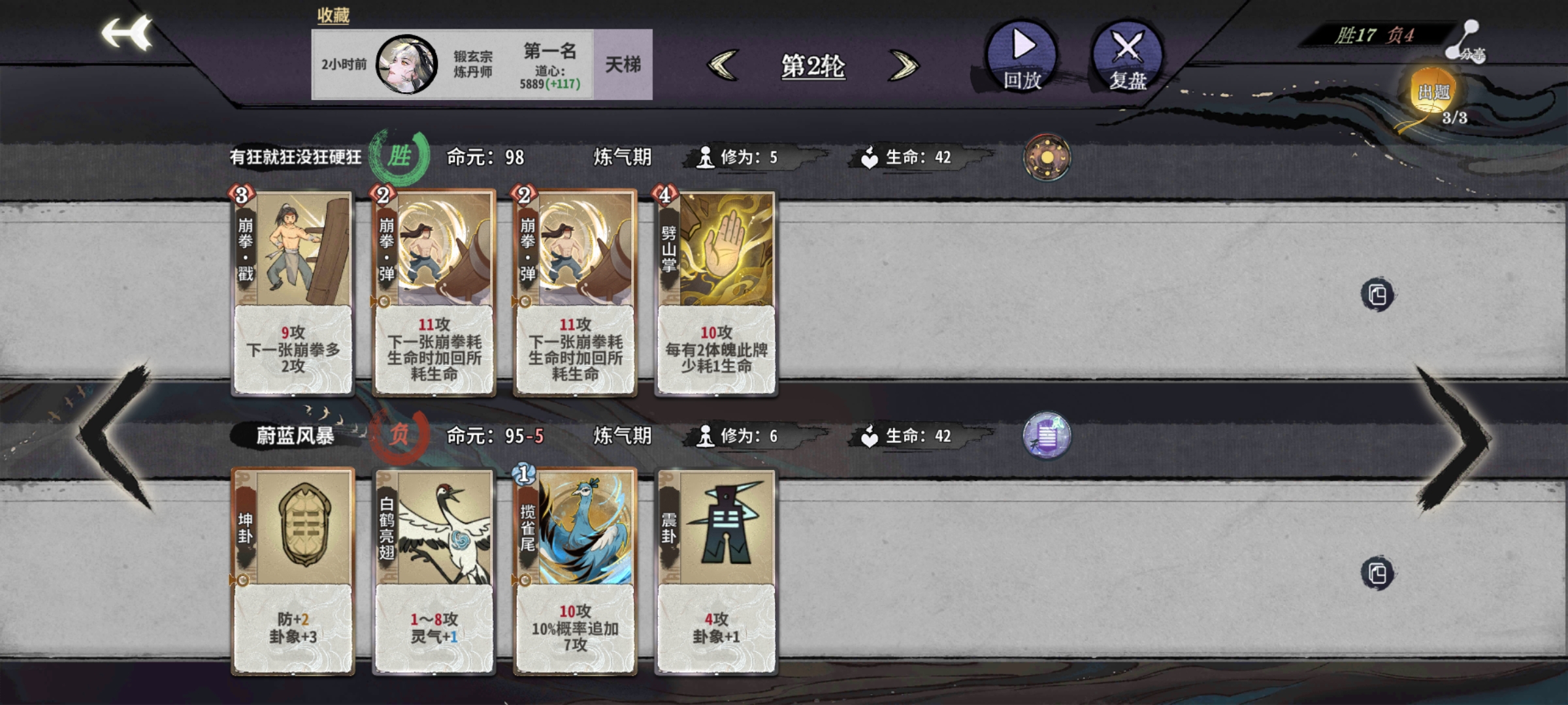 练气:d1-3轮,有三张崩拳、两张二级就可以停,三轮修为上本,极端一点来说,封都可以不扔等二级。