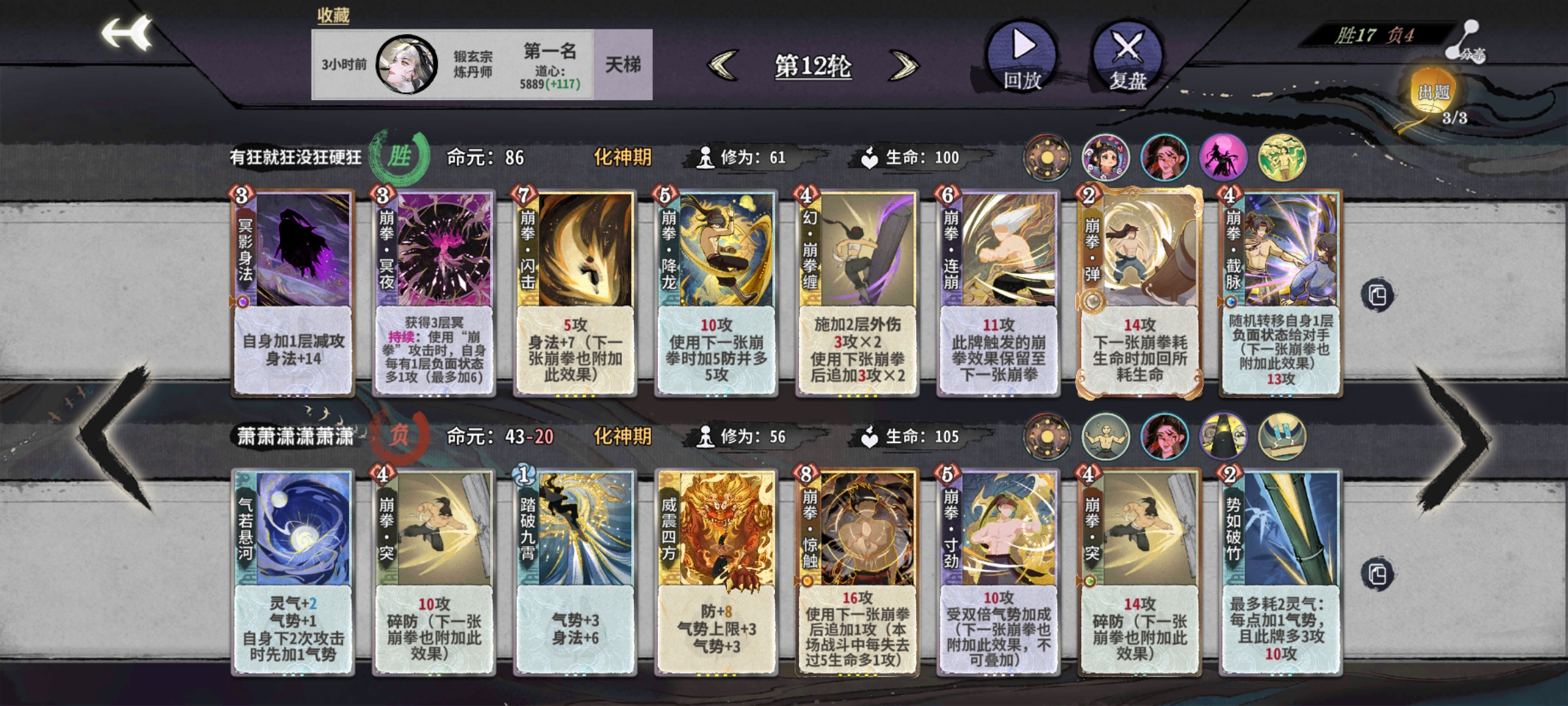 2. 有崩灭,并且有4张崩拳后,除了崩拳以外的任何牌都可以走了,崩灭冥夜后的崩拳保底4气势,哪怕崩天迎风对比双崩拳也已经没有数值优势了。