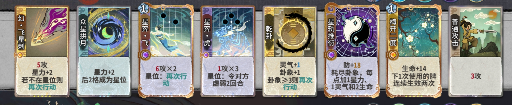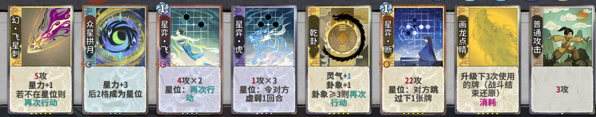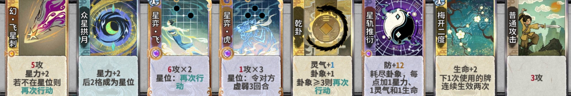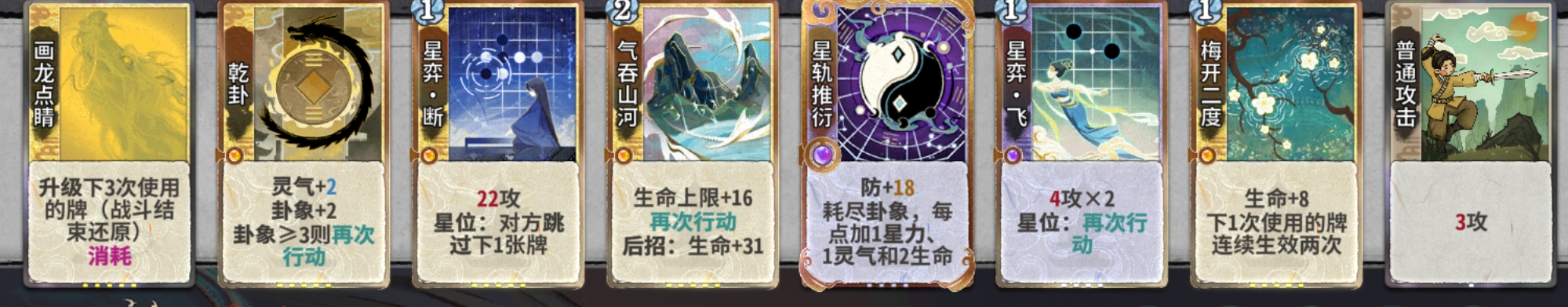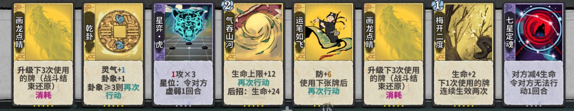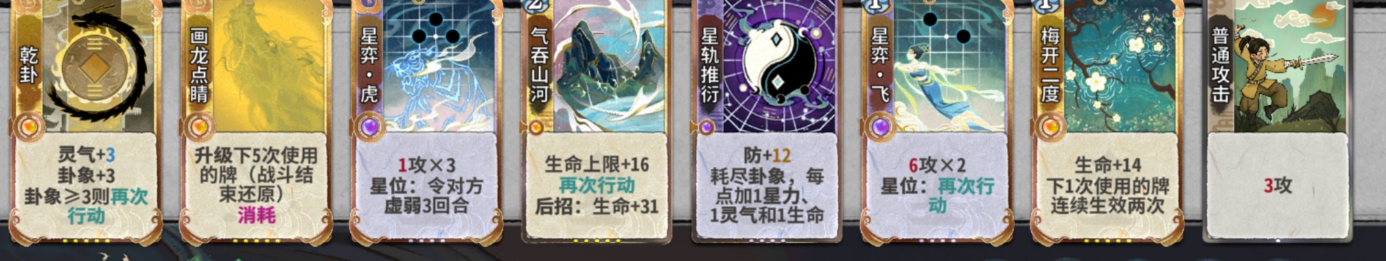 吃3:吃3的意思是在道韵选择炼气牌的情况下我们最多只能吃或合3张无关牌(下面会讲什么是无关牌),因此建议是在4轮道韵前最多只吃两张无关牌,4轮道韵选择后再选择吃不吃第三张牌。而道韵选择上乾卦>飞=虎>其他。