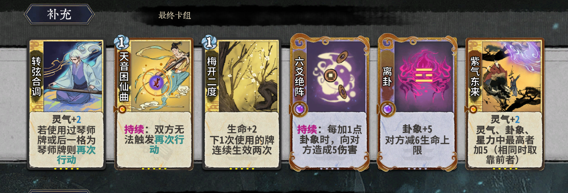 最终卡组分为两套,一套毒,一套梅开六爻,流水无情仅为过度卡。