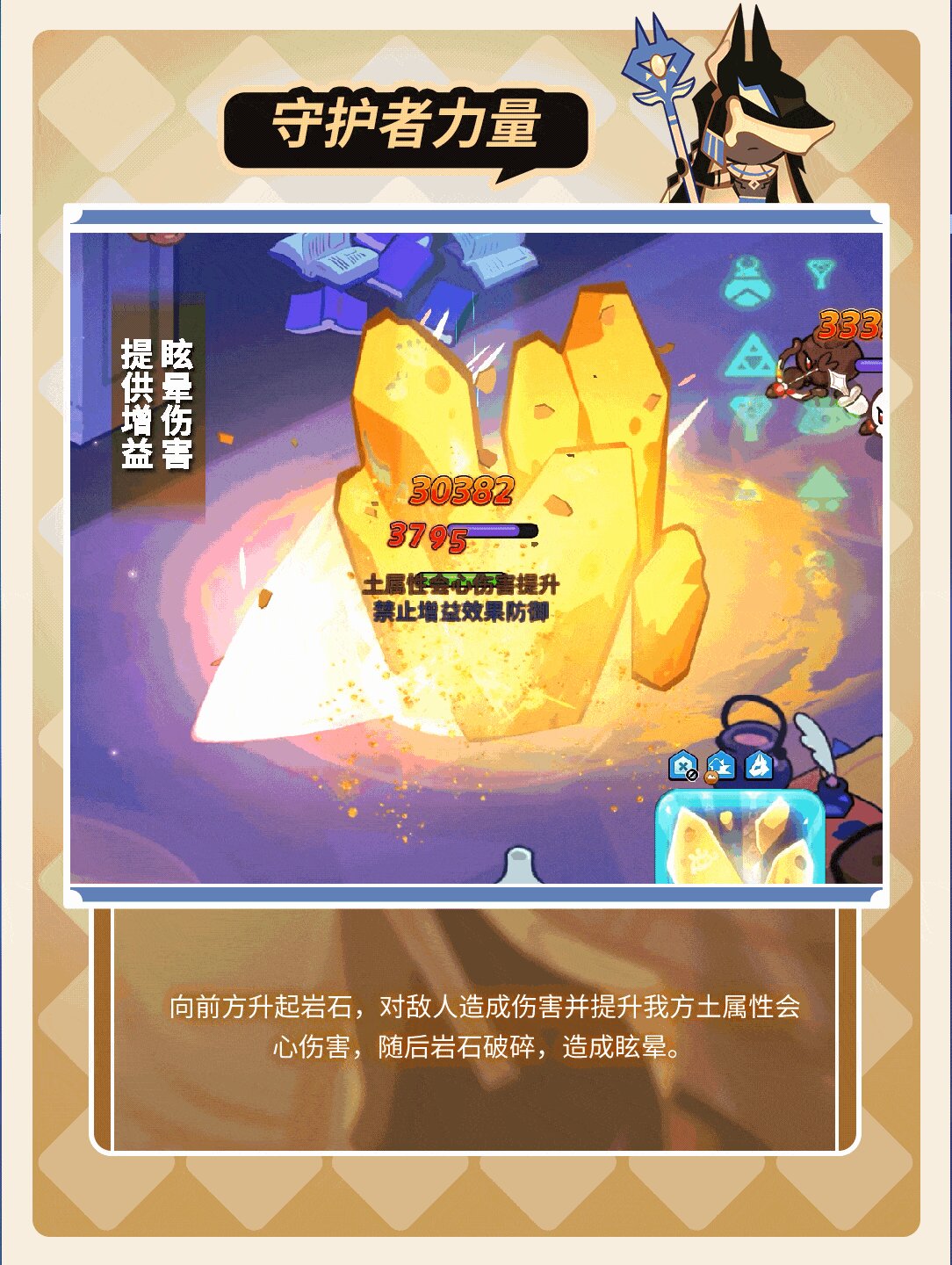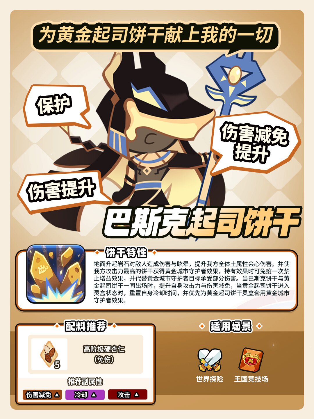 升起岩石对敌方造成伤害与眩晕,提升我方全体土属性会心伤害。使我方攻击力最高的饼干获得黄金城市守护者效果,持有效果时可免疫一次禁止增益,并代替黄金城市守护者目标承受部分伤害。当巴斯克饼干与黄金起司饼干一同出场时,提升自身攻击力与伤害减免,当黄金起司饼干进入灵盒状态时,重置自身冷却时间,并优先为黄金起司饼干灵盒套用黄金城市守护者效果。
