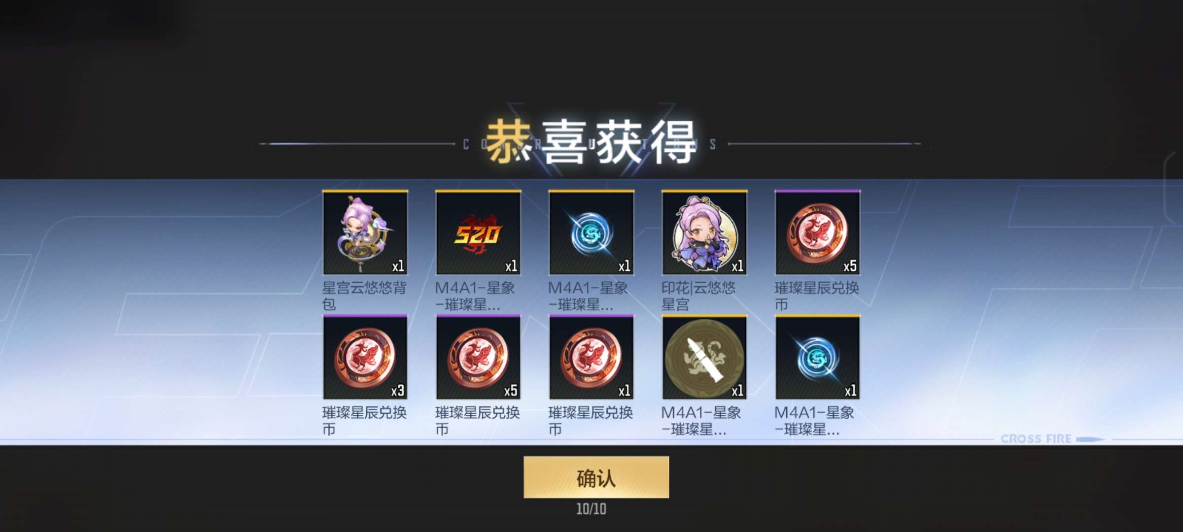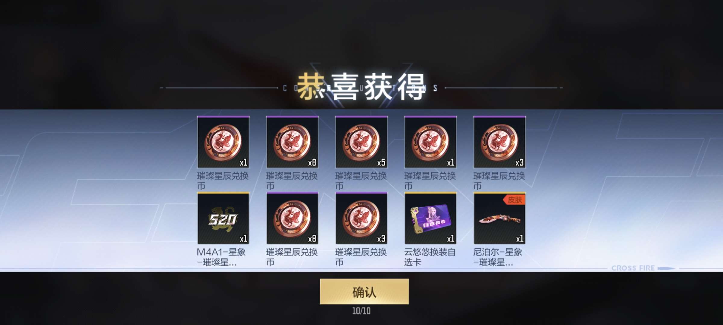 玩家应该都在夺宝一元购花费10元购买了13枚璀璨星辰抽奖币了,这时候想要试水的玩家,可直接参与抽奖试水,首次抽奖有9折优惠,所以玩家可参与14次抽奖试水,运气好的玩家可抽中永久道具,就算没抽到永久道具也没关系,还可以用抽到的璀璨星辰兑换币,在兑换商城兑换自己想要的道具。听说有玩家5次十连就抽到M4A1-星象-璀璨星辰·朱雀皮肤了,运气是真的好。