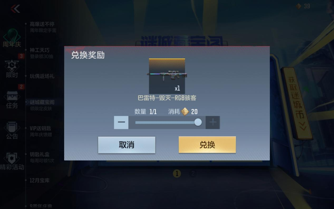 穿越火线-枪战王者【活动分析】谜城藏宝阁限时重启,巴雷特-毁灭-RGB骇客等你兑换如下: