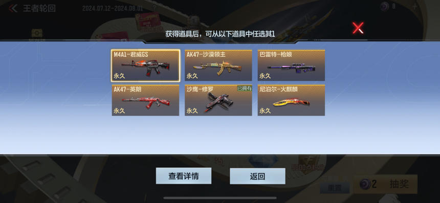 本期英雄级自选卡可选择M4A1-君威GS、AK47-沙漠领主、巴雷特-枪娘、AK47-英朗、沙鹰-修罗以及尼泊尔-火麒麟,分解可得17轮回币。
