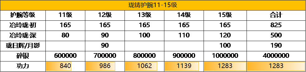 94级开放护腕珑铸11-15级的提升。护腕升12级和15级分别需要90和100总计190个珑日辉/月影护腕。每次升级需要165个冶玲珑·初,总共需要825个冶玲珑初,这下冶玲珑初这次宣告告急。如果银两充裕可以选择购买除护腕之外的其他部位的珑铸材料分解来获取。