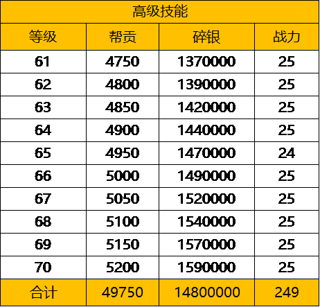 94级开放高级技能攻抗60-70级,总共需要49750帮贡和1482W的碎银。提升249点功力。高级技能的性价比一般般,但是也只是相对中级和低级技能。无论是帮贡还是碎银想要靠一周的积累拉满还是很有难度的,以下为具体消耗明细。
