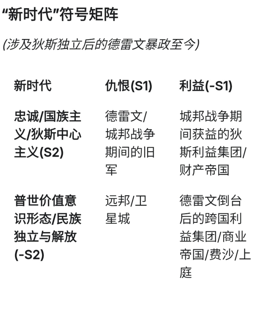 这里嵌套了两个符号矩阵,上方的是“旧时代”的符号矩阵,涉及希露坦身处的过往历史年代。下方的是“新时代”的符号矩阵,涉及的时间线从狄斯独立后的德雷文暴政至今。这两个符号矩阵虽然结构和内容不一样,但四个词项(S1、S2、-S1和-S2)都是一样的,都是:忠诚/民族主义、仇恨、利益和普世价值意识形态。因此,当剧情的最后,局长坦诚狄斯城正在走上宗主国的老路时,我并不将其解读为狄斯城正在重复宗主国曾经所作所为的具体行径,我将其解读为:狄斯城正在缔造一套与昔日宗主国类似的支配秩序,狄斯城秩序与宗主国秩序的差异,是同一结构的不同变体,即相同结构要素的不同排列组合。