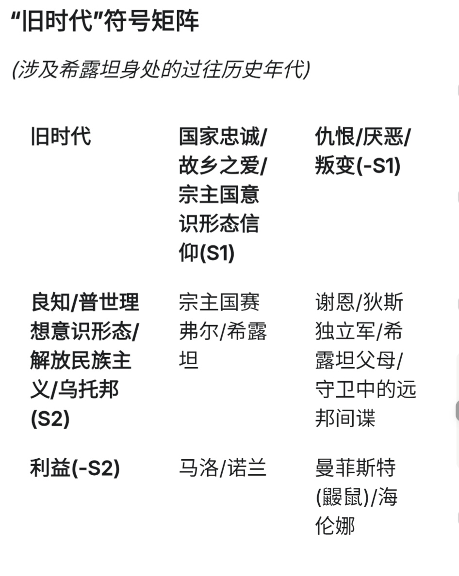 那么到此,我们总算解读完了整个旧时代的符号矩阵了。严格来说,符号矩阵的填法没有唯一解,只看适不适合,能不能给出有生产力的解读,这个矩阵没有涵盖剧情中所有的角色,但基本覆盖到我观看剧情时认为比较重要的角色了。如有遗漏疏忽,还望批评指正。