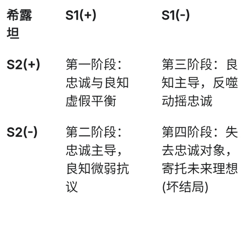 我们可以构建一个专属于希露坦内心悲剧的动态符号矩阵,并详细阐述其四个阶段,其主要矛盾是S1[忠诚] 和S2[良知],四个词项分别是S1(+)、S1(-)、S(+)和S2(-)。