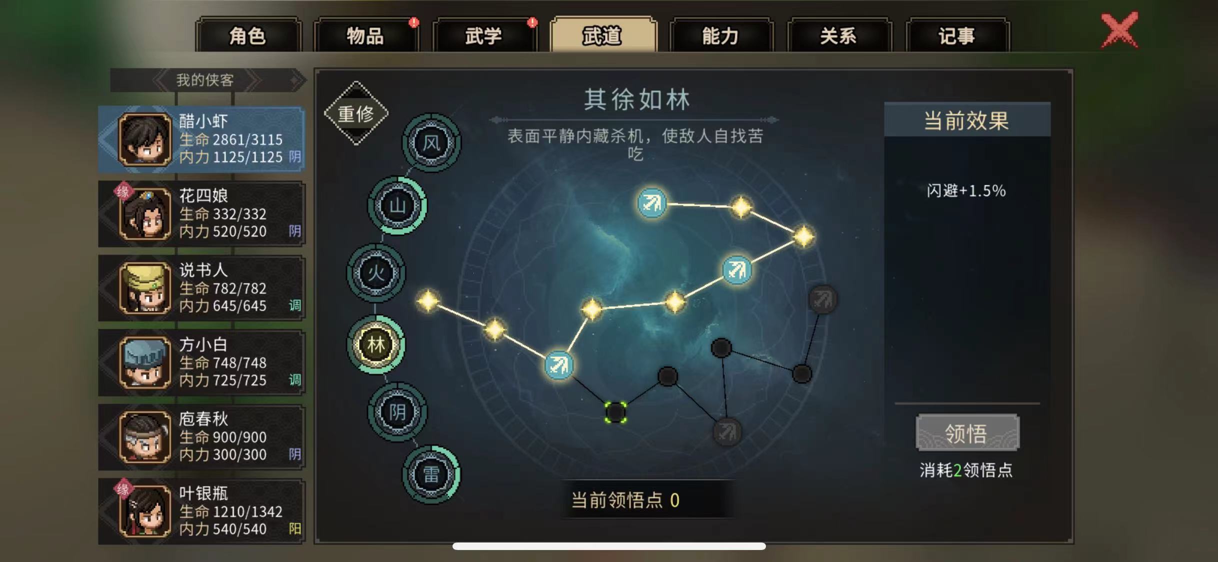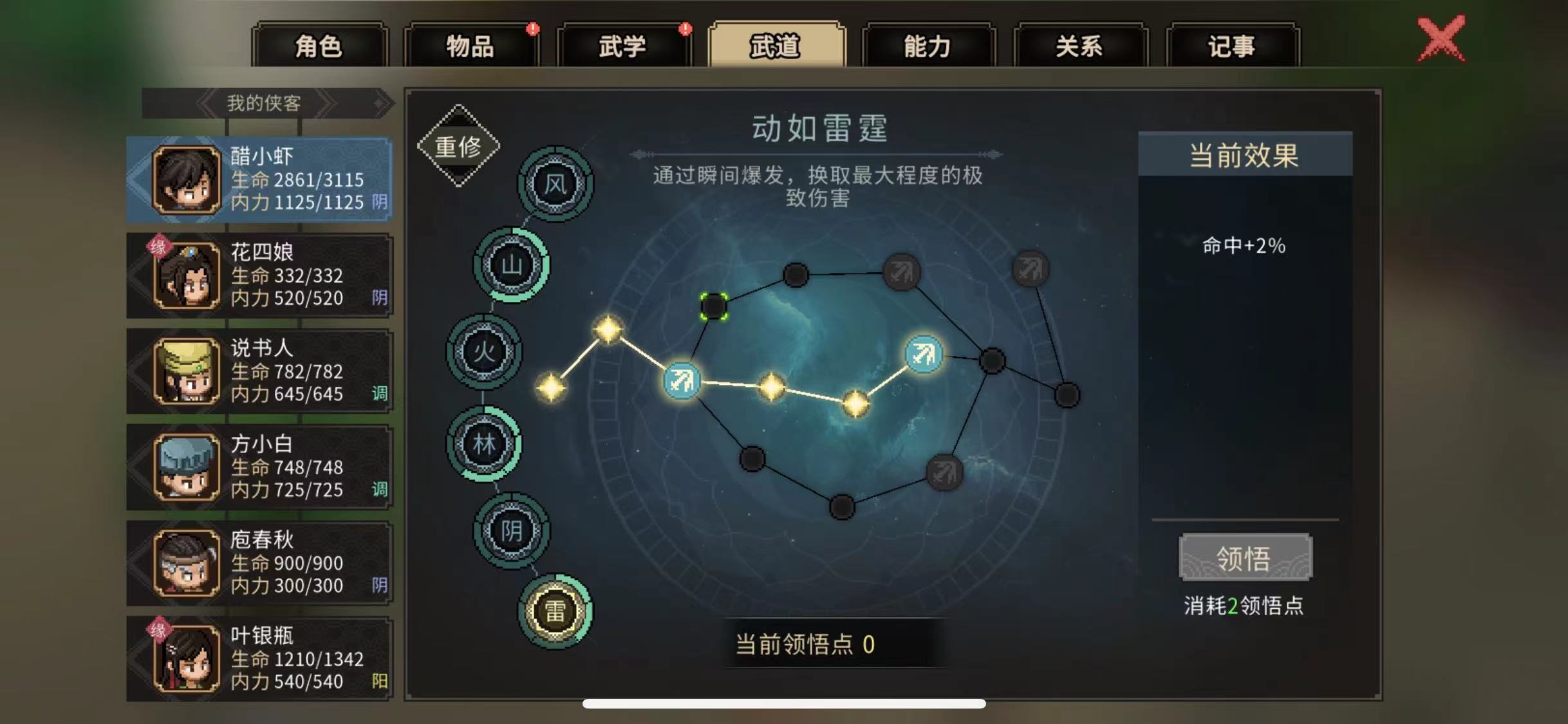 进入游戏先把臂力点满,武道一般就两套自己看情况切换,清小怪点风火,单挑boss点山雷,