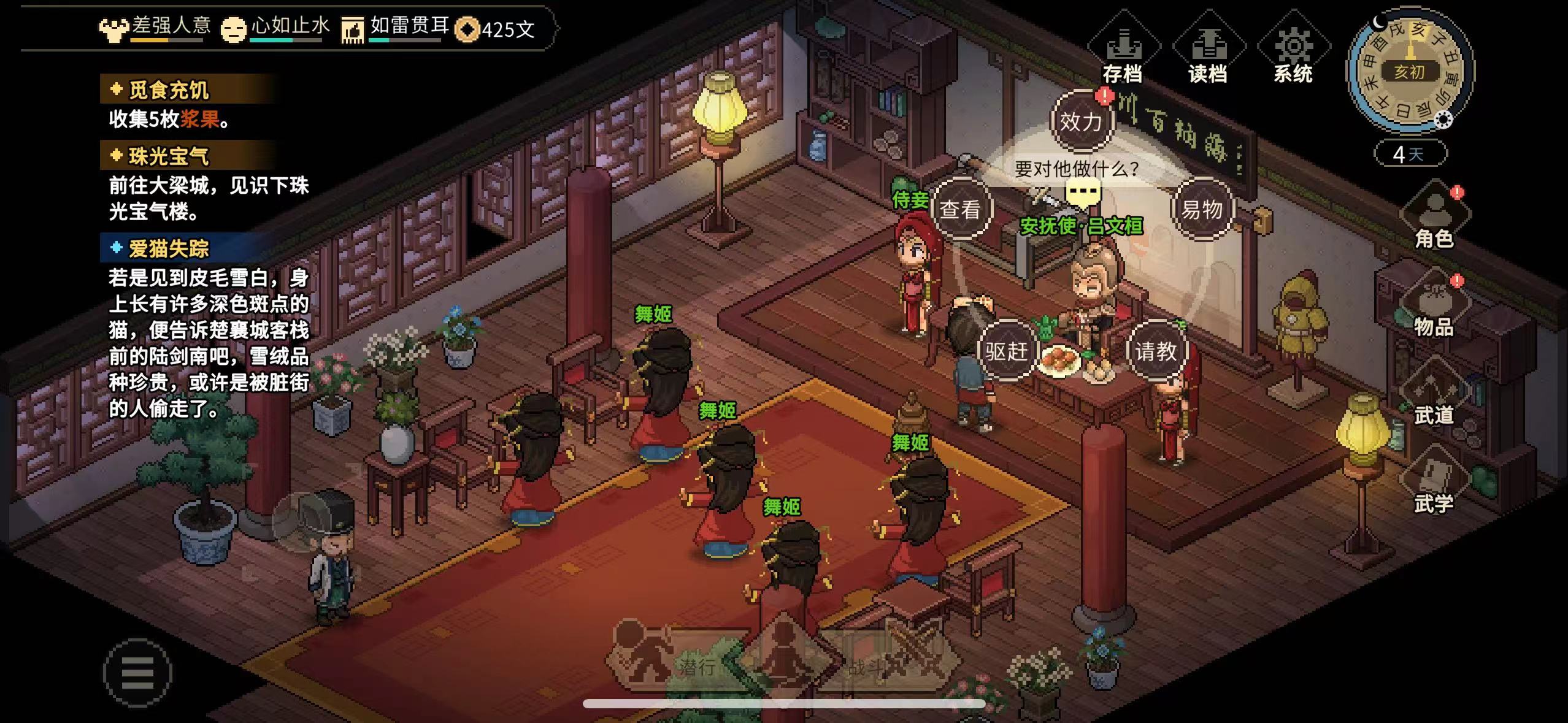 陆续把白头翁、猎户、包打听、洪小七收入队(不需要满好感,40+即可,入队第一件事就是装备送礼加成的饰品),未时到亥时到客栈触发叶银瓶剧情帮她付钱500,在第三天进客栈,触发四娘的剧情,收四娘,支线不够钱做也没关系,后续可以把四娘踢了再对话触发(帮铁匠给钱可以拿个伐木buff的配饰,后续想刷满能力的建议给钱,不刷能力就直接带四娘去收铁匠不用出钱)