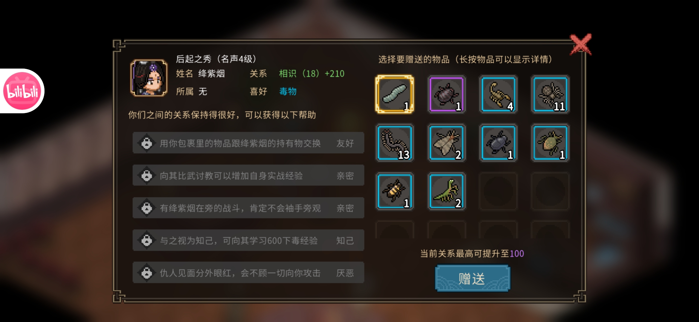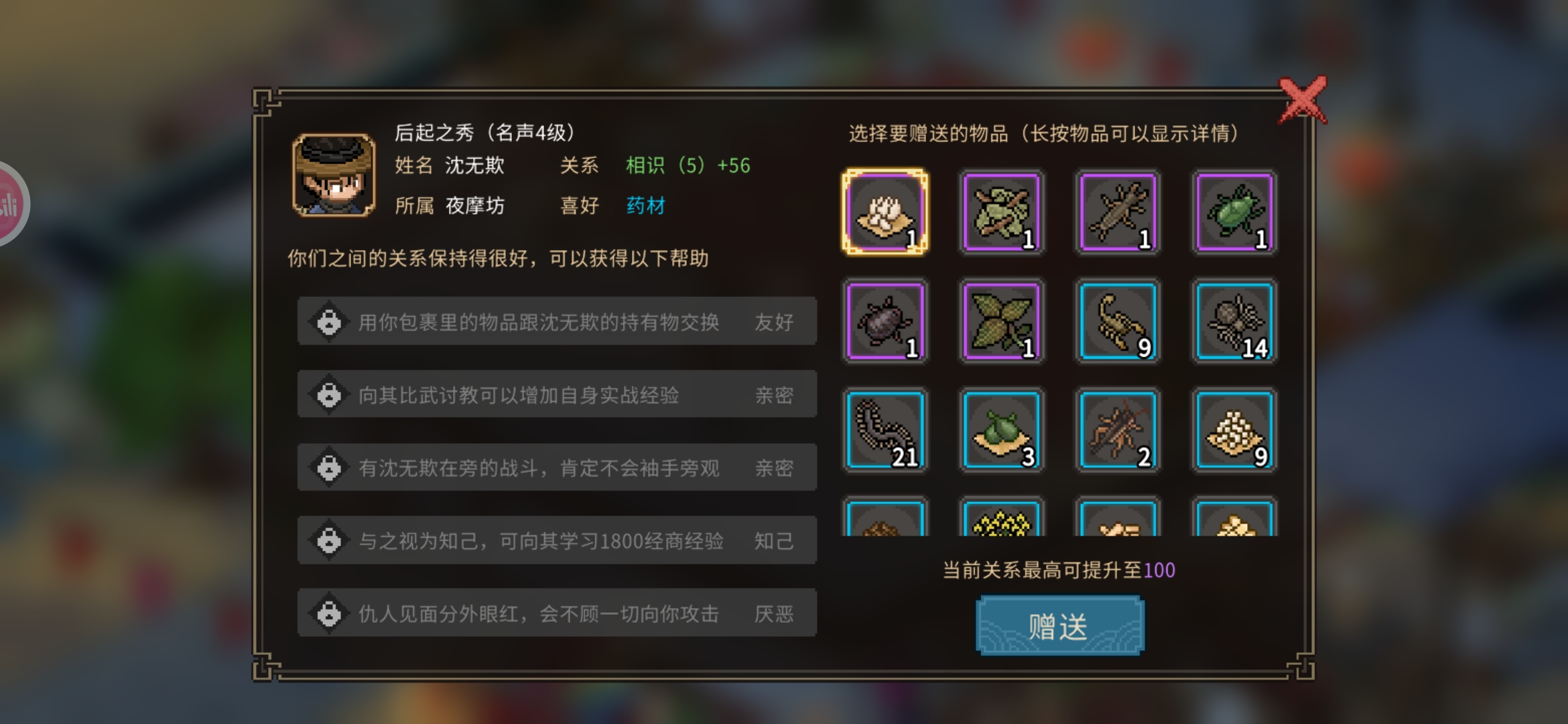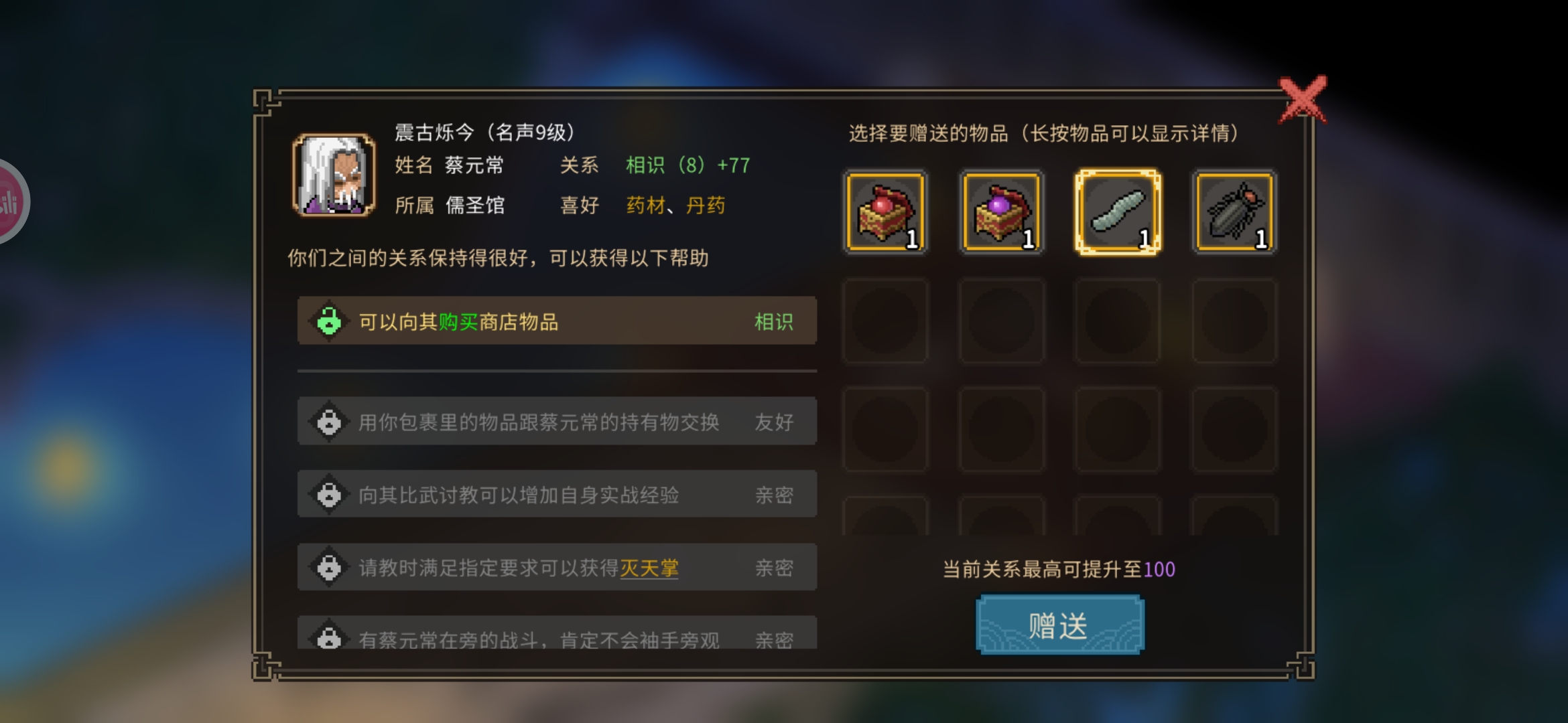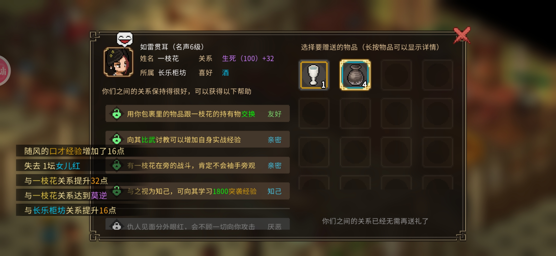 这里送礼主要是刷六艺中的仁礼义(至100),其次是成就,没给部分人送满其实不要紧