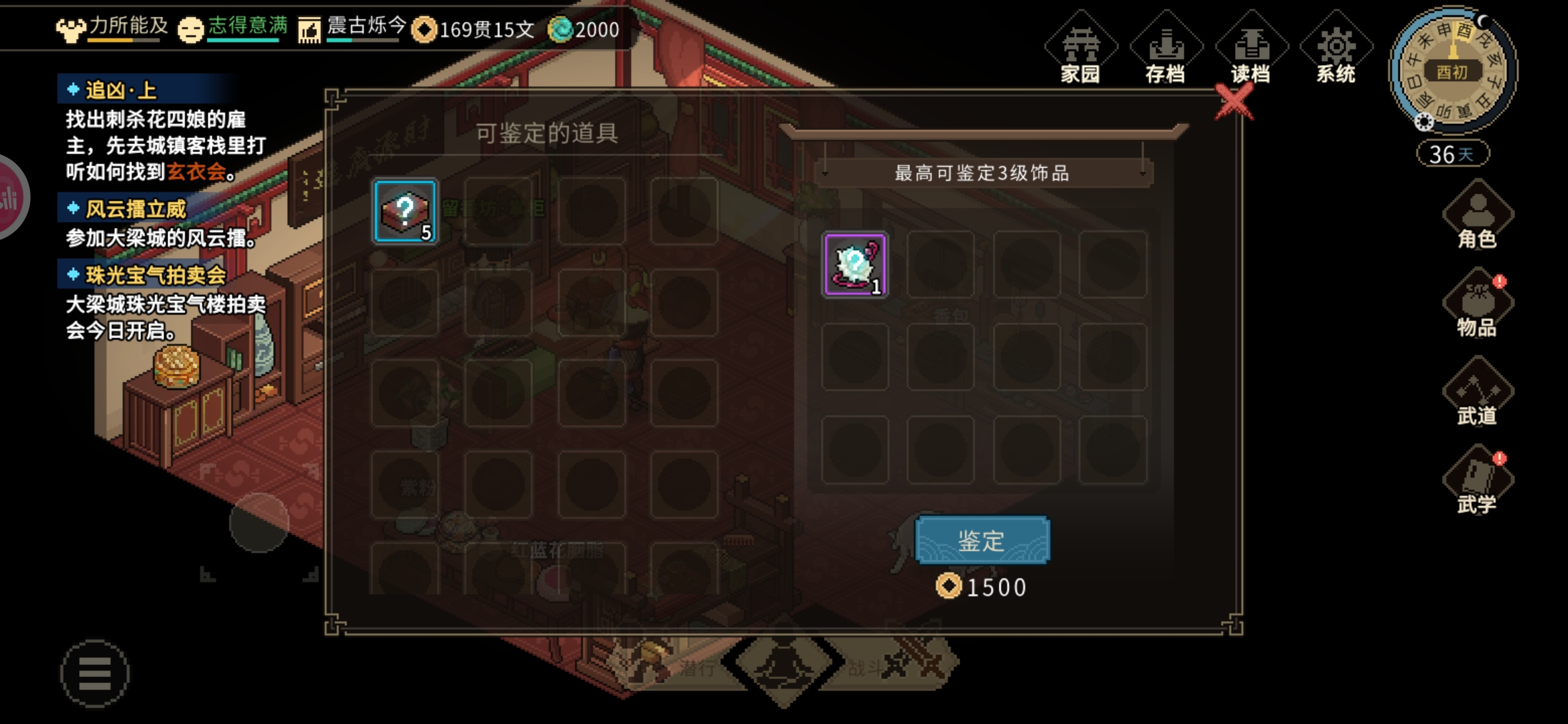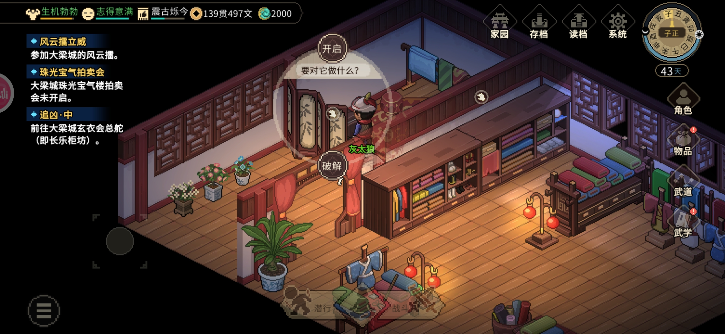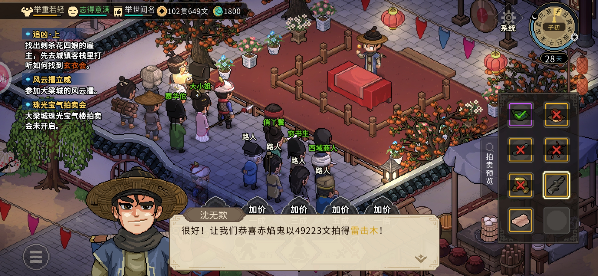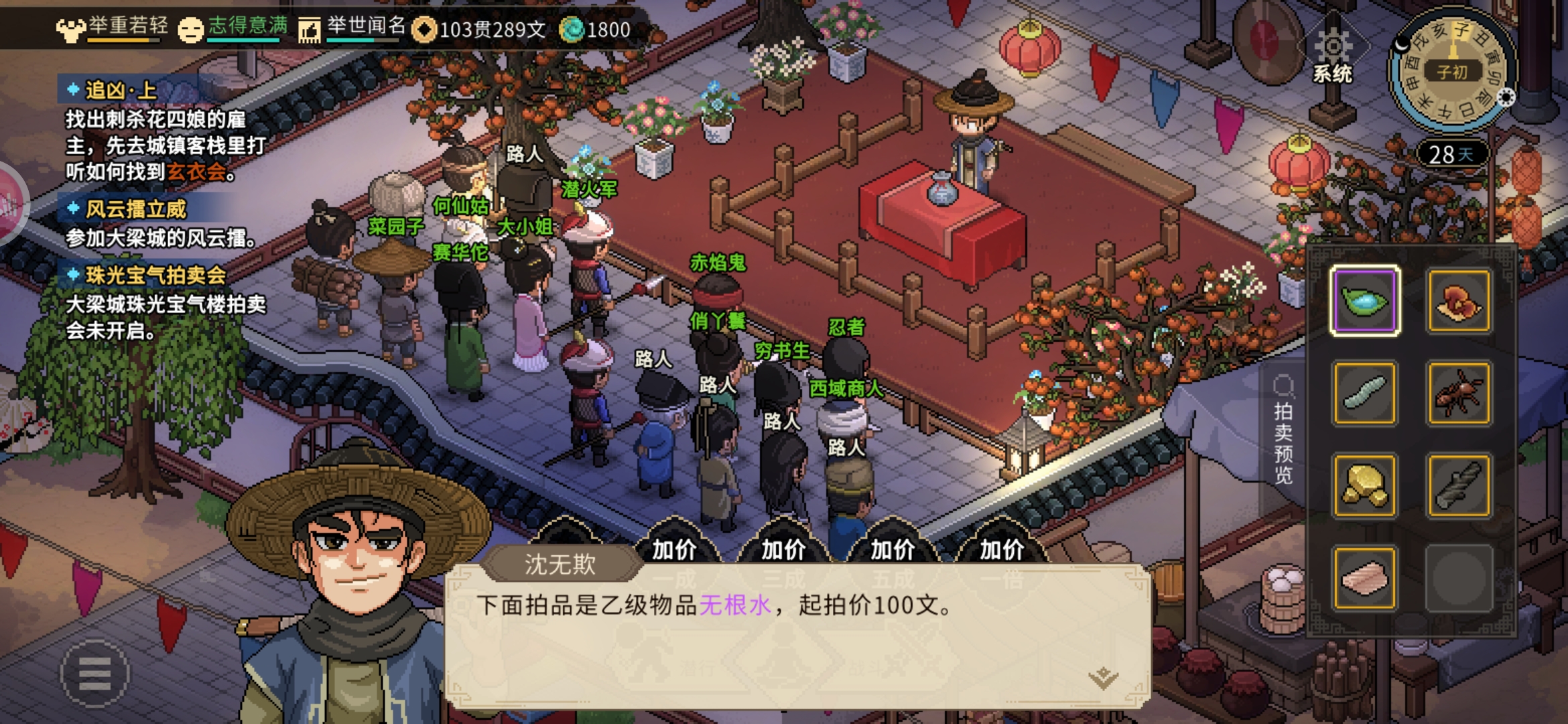 子时参加拍卖会——儒圣馆拜孔子——回大梁城对对子——买布,当铺买鉴定品,杂货铺买工具——参加擂台(打到乙级无视)——后山采集