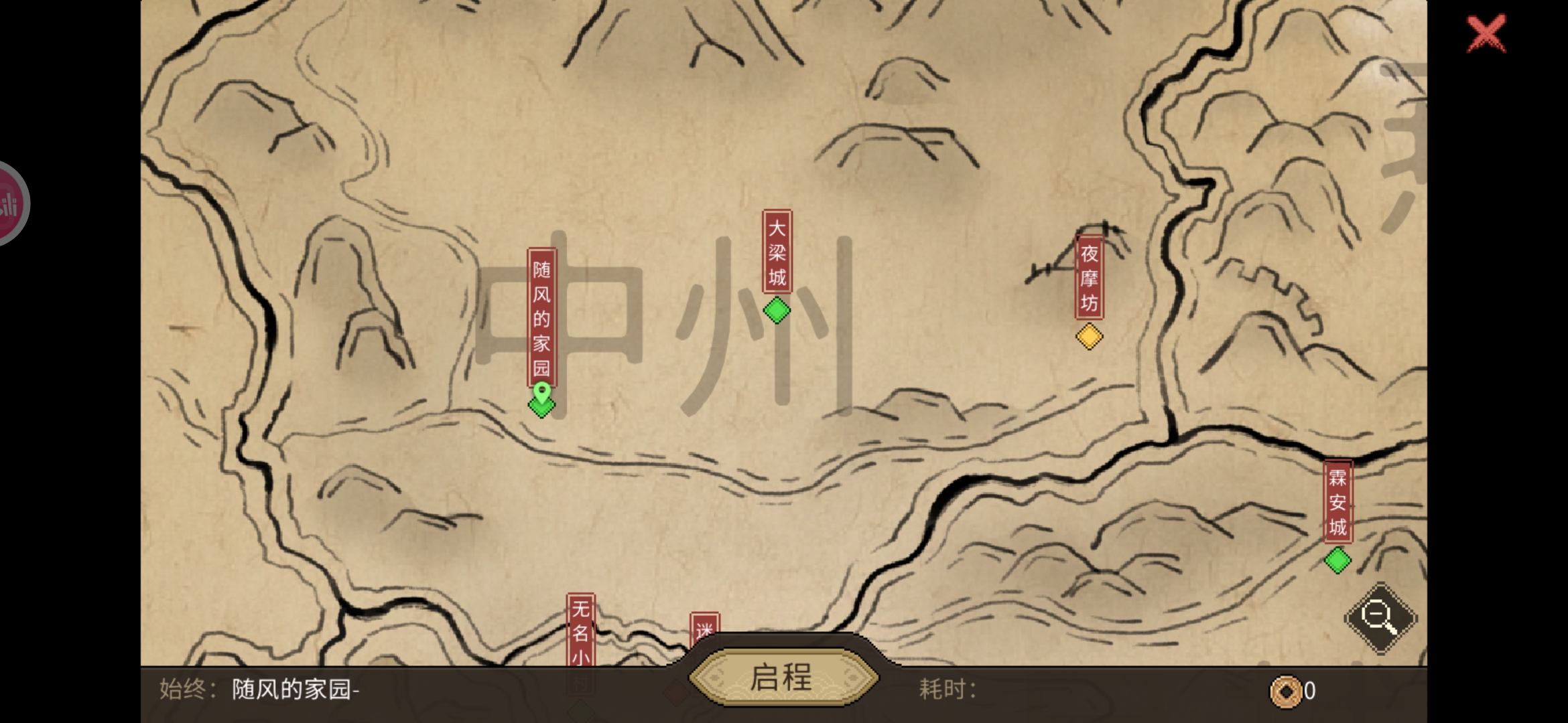 市集—当铺—杂货铺—楚襄武馆—心湖—隆中书院—奇珍坊—铁匠铺—红袖阁—衙门—品茗轩—安济堂—福临客栈—忘忧楼—楚襄丁家—白云观—武备库—将军府外围—脏街