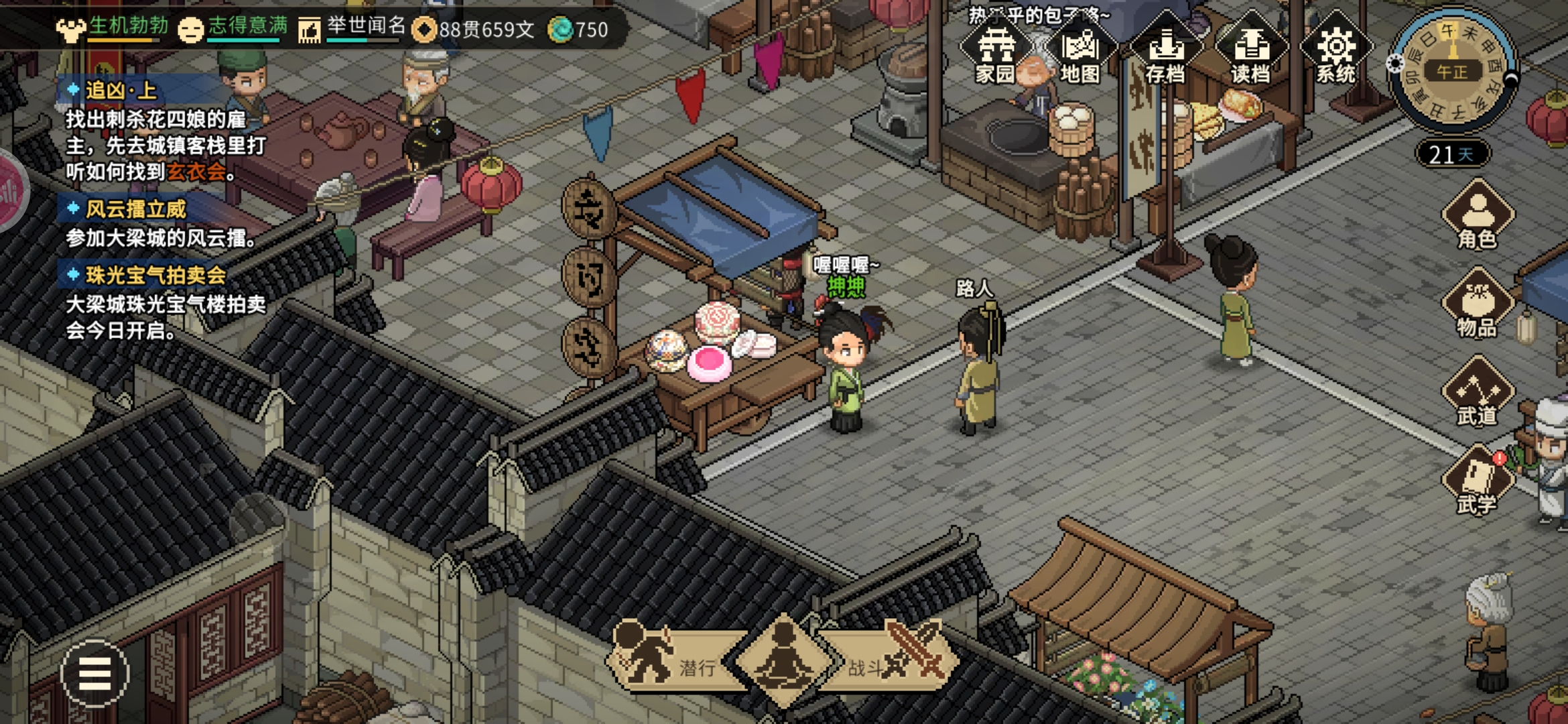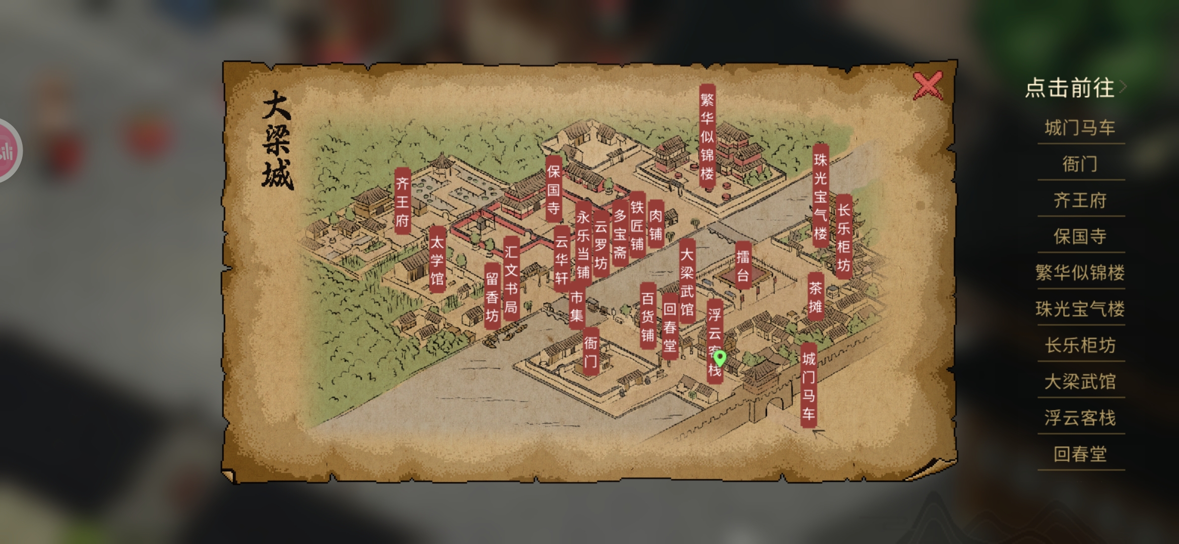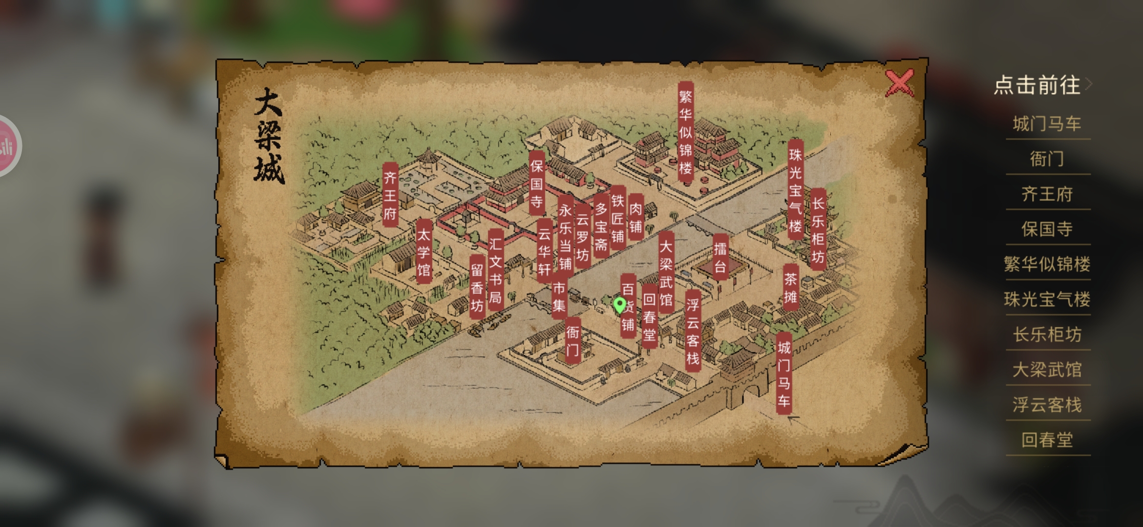 市集—汇文书局—留香坊—太学馆—云华轩直走所有店铺—珠光宝气楼—长乐柜坊—茶摊—擂台—大梁武馆—回春堂—百货阁—衙门