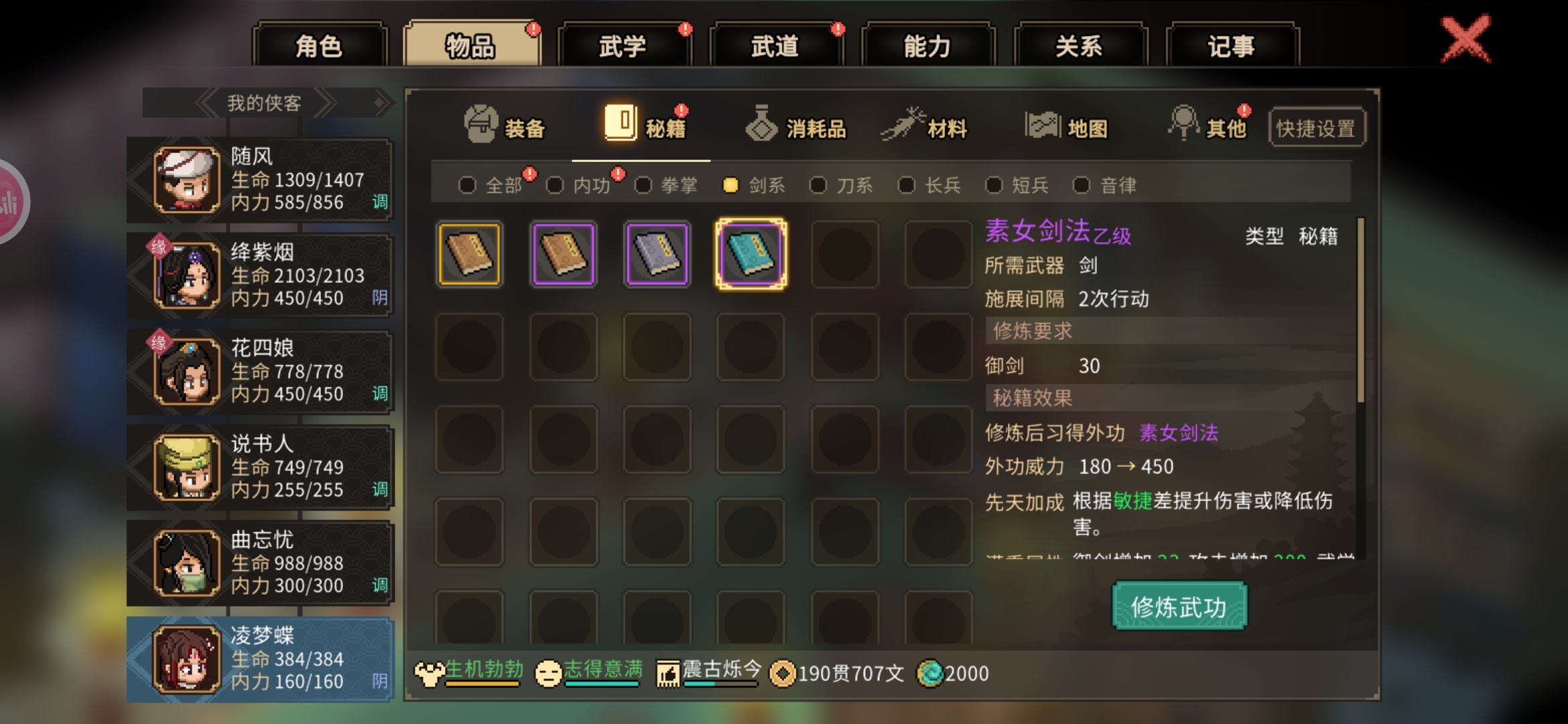 这个NPC很厉害,比之前带过的所有队友潜力都大(甚至打过一架后比除了老怪的其他人都强),给她学一本素女剑法
