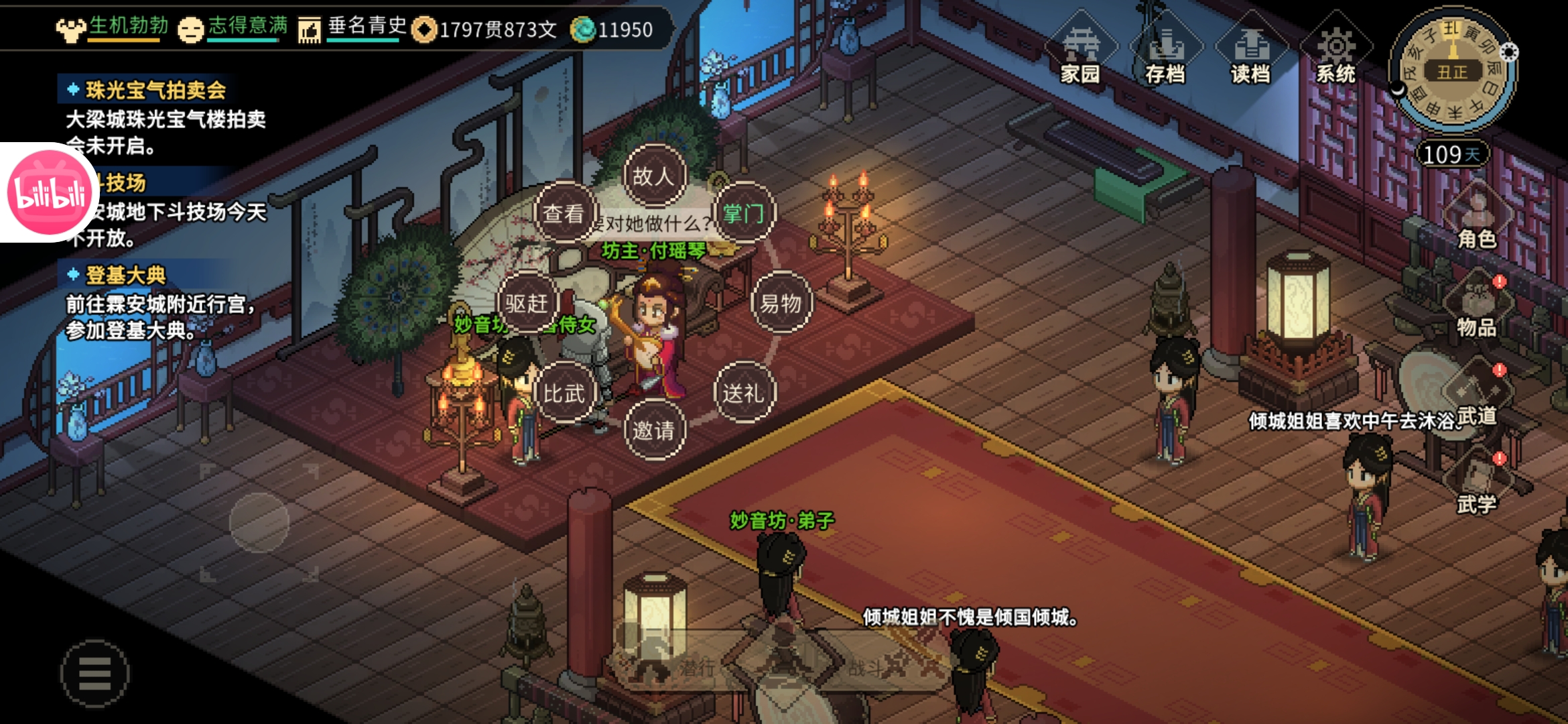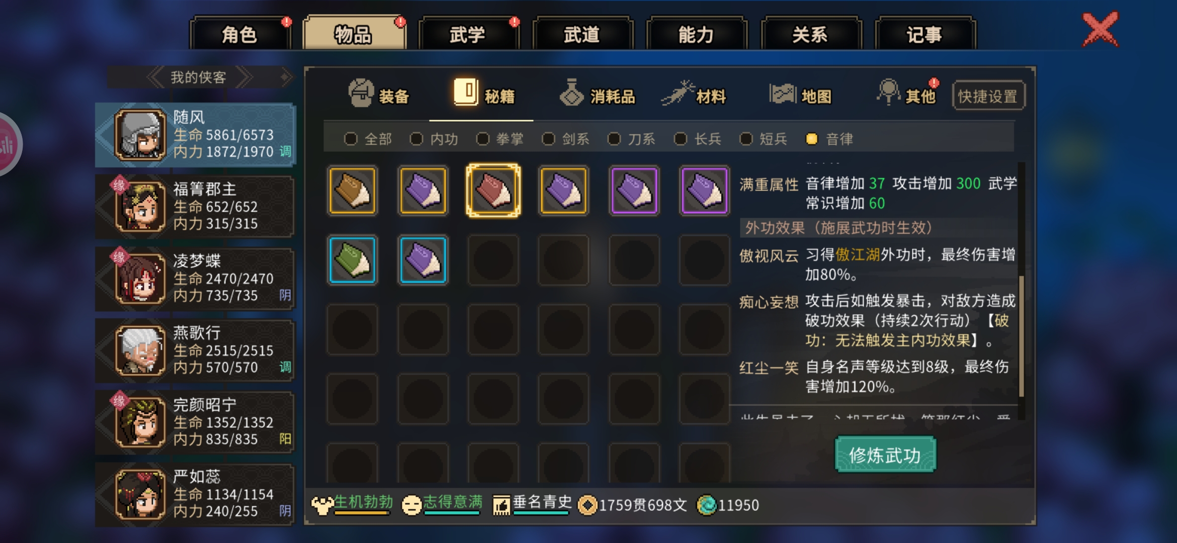 音律这本和傲江湖学了能找付瑶琴拿一把琴,你知道就行,然后记得邀请入队,不然镇压三教没法触发剧情(我这里忘了,镇压完才发现没带付瑶琴,不过问题不大,只影响个人线剧情而已)