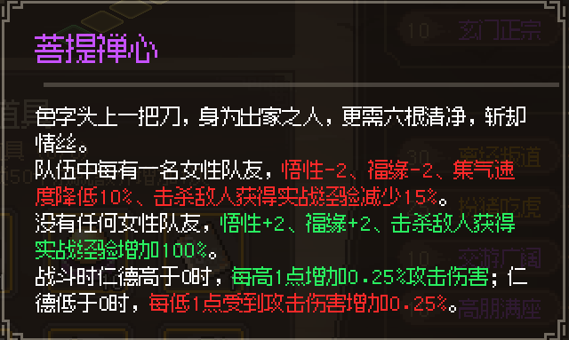 这里需要将得道高僧特征和转世佛子特征进行区分,转世佛子是包含了得道高僧的同时还附带了悟性+5以及初始仁德为100两个词条的。