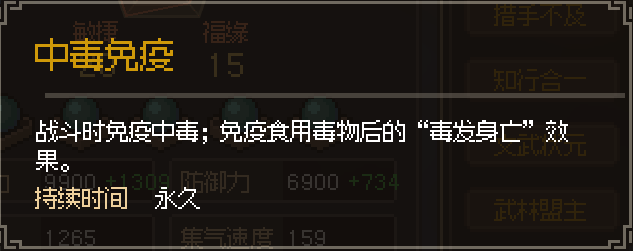 甲级特征:中毒免疫。获取途径:医术到达100后,和苗彩蝶关系到达100,我们会知道怎么帮她治疗她的隐疾,潜入毒龙窖,喂食毒龙三个甲级毒物,会掉落一个毒龙蛋,食用毒龙蛋会获得此特征