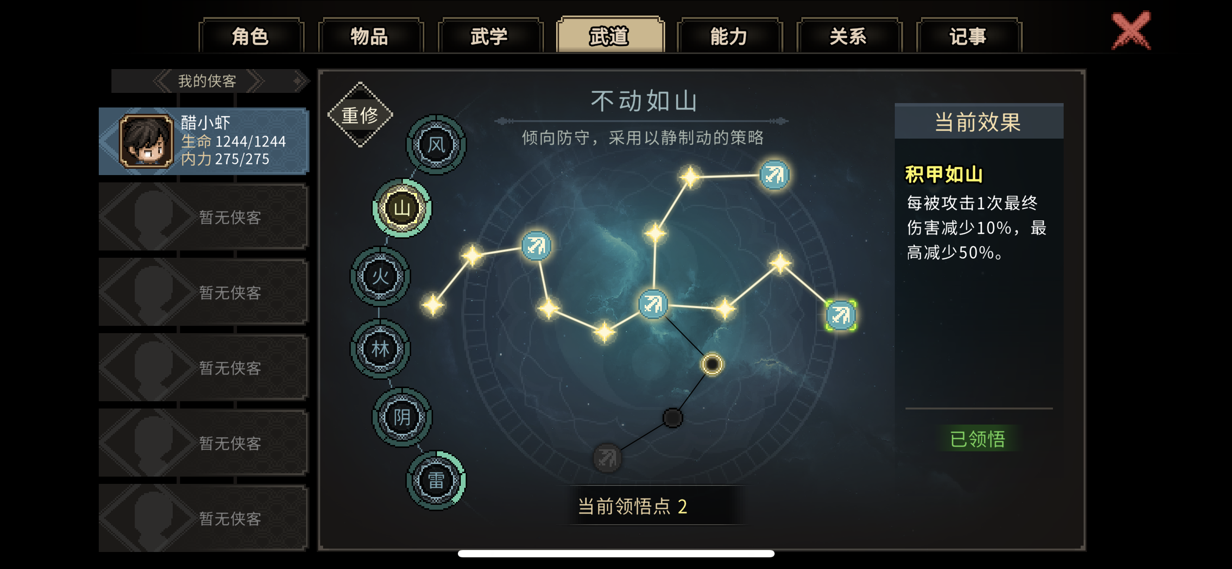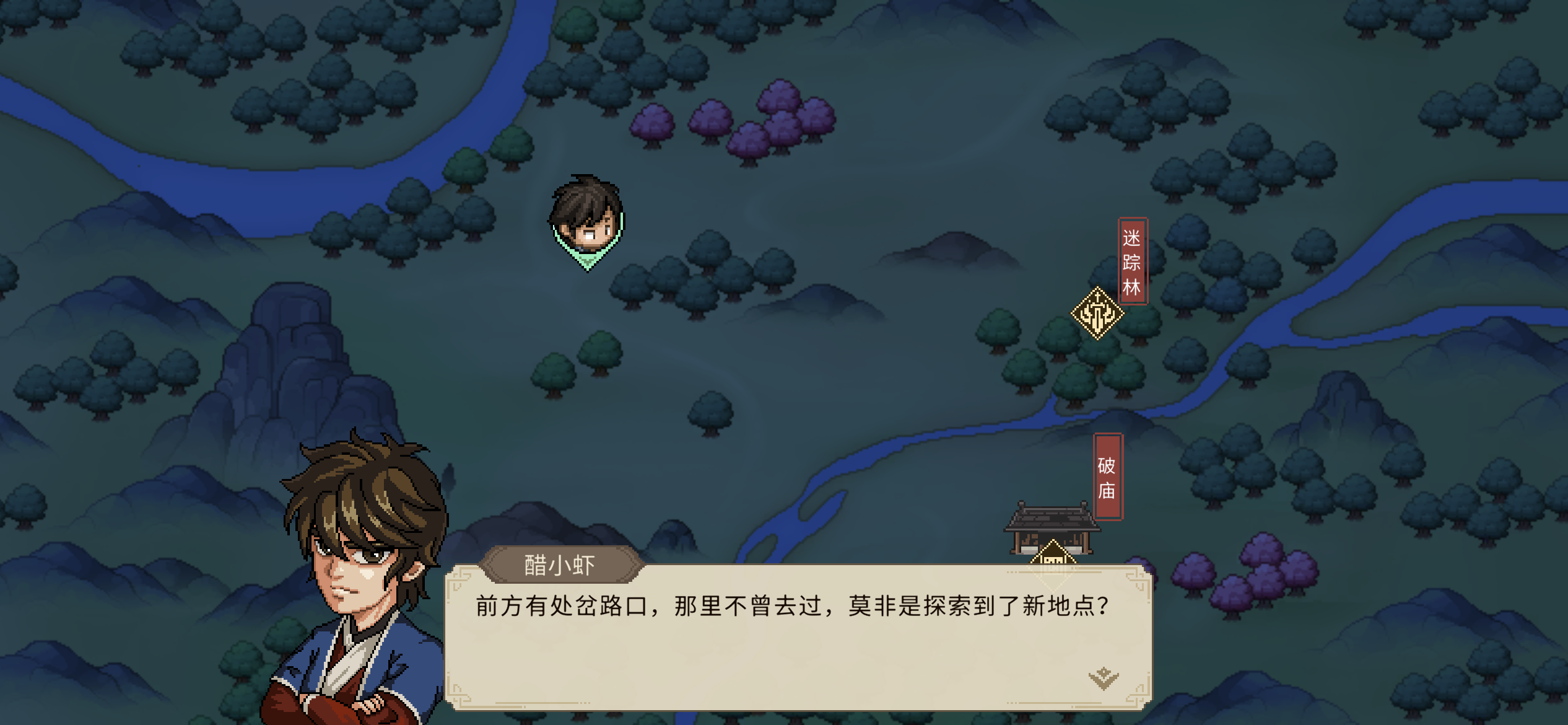(非必做,可跳过)如果不嫌麻烦的话,可以先去迷踪林解锁无名小村,在无名村打坐到白天找包打听闲聊解锁大王寨,再去十字坡触发剧情,然后放山贼走,收说书人(天赋+名声buff),天黑了再去无名小村,触发山贼进村的剧情拿虎牙吊坠(+名声buff)给说书人戴上,再去灭了大王寨和海蛟帮,基本就4级名声了(感谢评论区 剑来 大佬的提醒,还是在这里补上这一段吧)