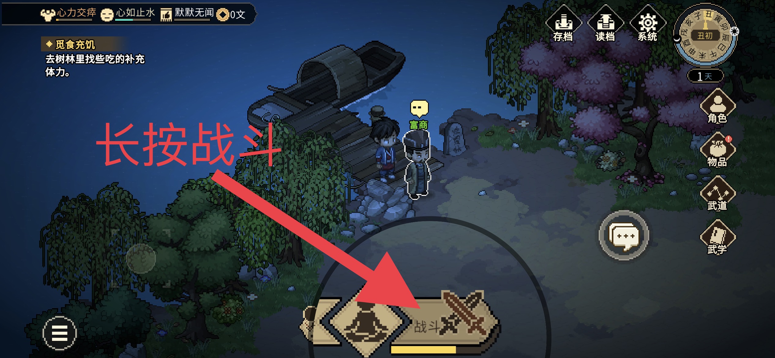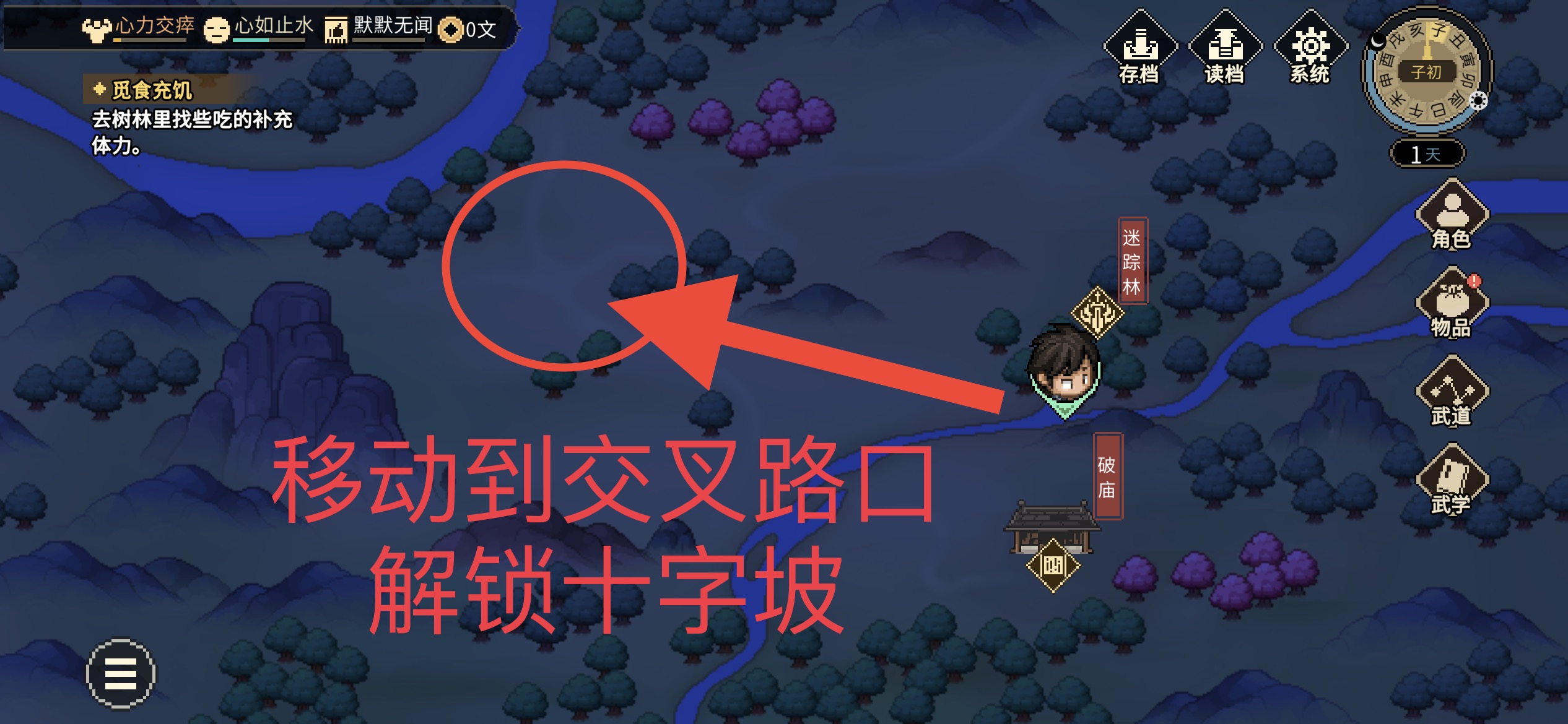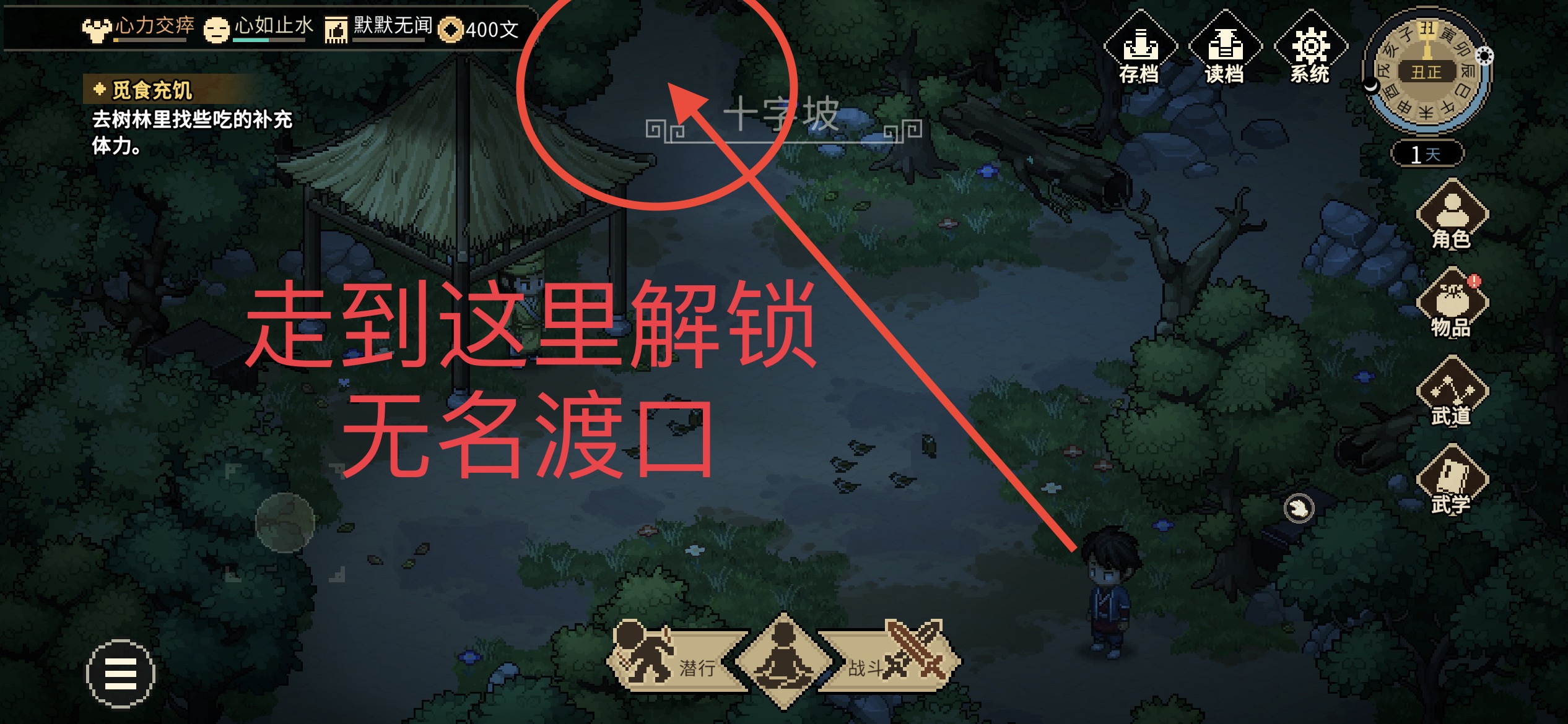 进入游戏跳过两女的剧情,直接出门,然后直奔十字坡,然后去十字坡左上角解锁无名渡口,在富商背后长按战斗,把他嘎了,出大地图重进渡口即可解锁船夫