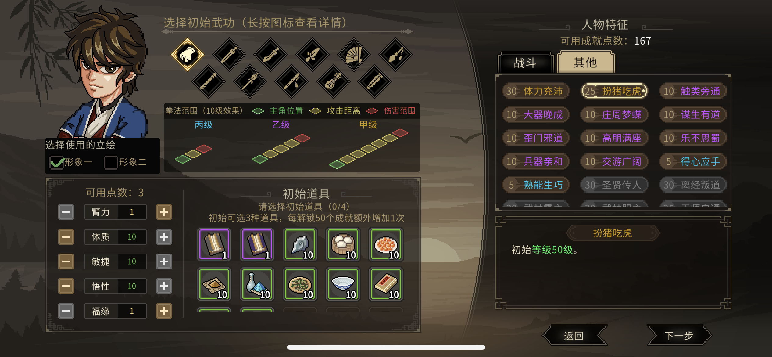 适合一周目没怎么认真刷过成就以及需要培养家园等级的大侠,休闲开局把扮猪吃虎点了,取名界面左下角把家园跨存档打上勾,物品带个包子应急,其他的看自己要刷什么成就,比如刷拳掌200的成就,就把悟性加满,天赋 拳掌奇才和精通,以及加实战经验的都点了,以此类推,针对性的选天赋去刷才能事半功倍
