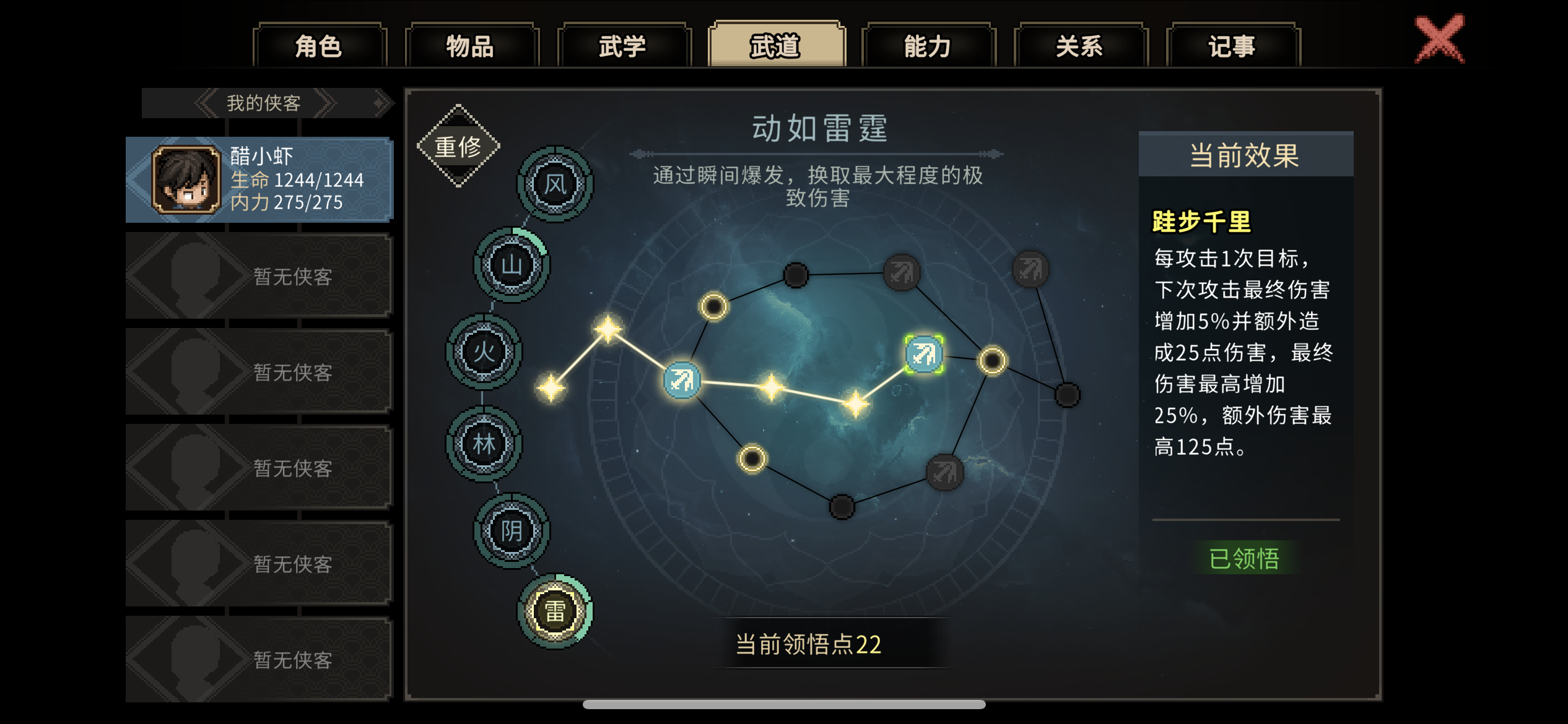开局先把武道和属性点了,建议点山雷,如果不用刷燕子窝和神捕门的成就,建议把两个女的都秒了,拿点启动资金,然后照旧直奔十字坡解锁无名渡口(记得把作者送的装备戴上),跟基础版的区别是直接跟富商对话,答应去海蛟帮,然后把海蛟帮秒了,睡觉到官兵来即可直接传送到霖安城,