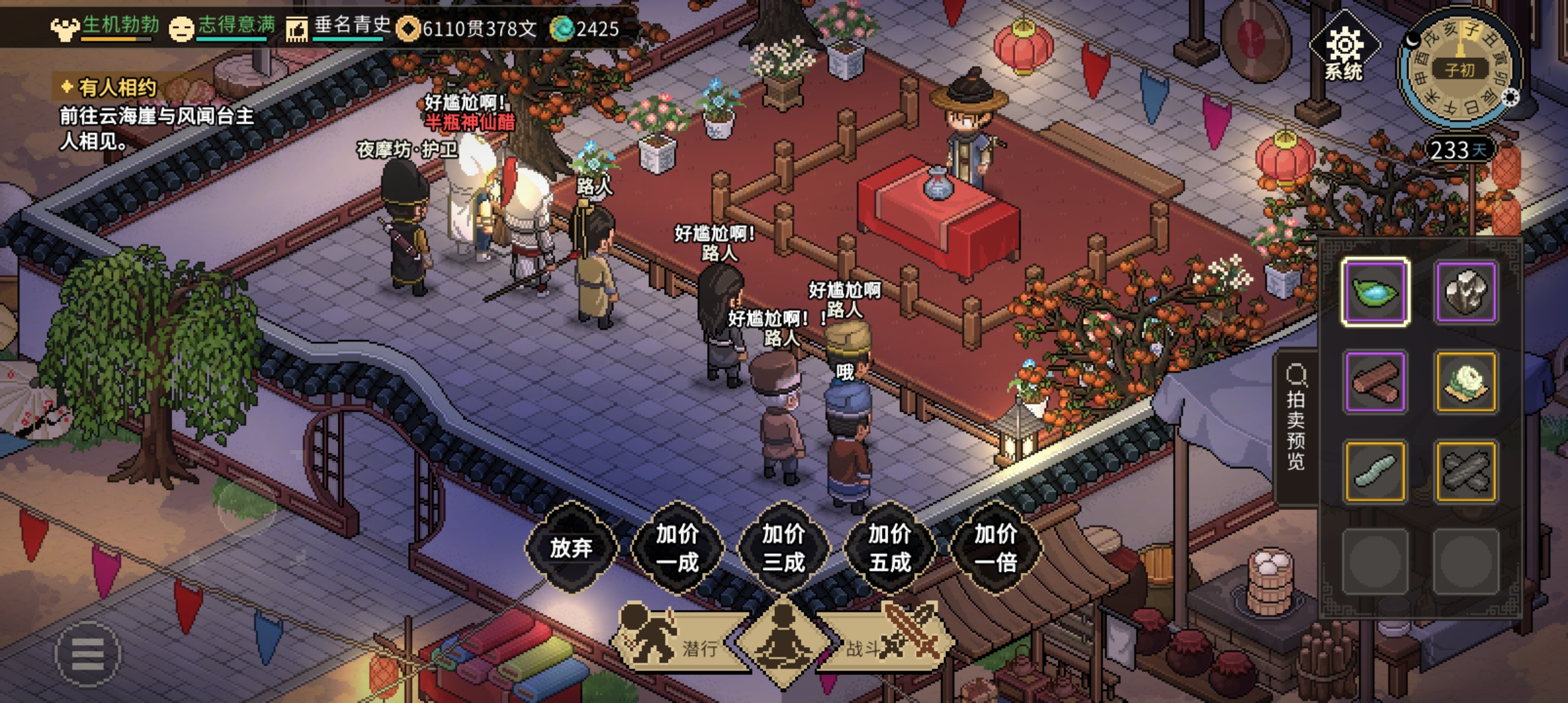 2.杀完拍卖行去找扶摇子调解关系,调解完了第二次去先送礼然后继续清场,当我们清场次数达到3次以后,拍卖场会出现半瓶神仙醋,并且拍卖场其他NPC除了你以外都不会出价,也就意味着咱们可以最低价拿下拍卖物品