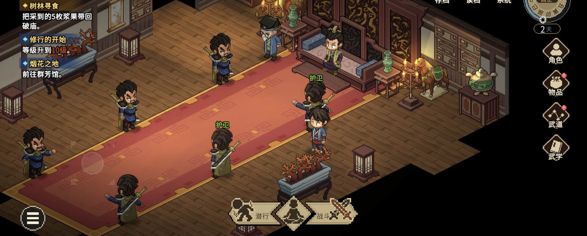 我们直接进肯定是不行的,接来下就需要一点小技巧了,站门口潜行给两个侍卫勾引出来,然后我们从背后绕进去