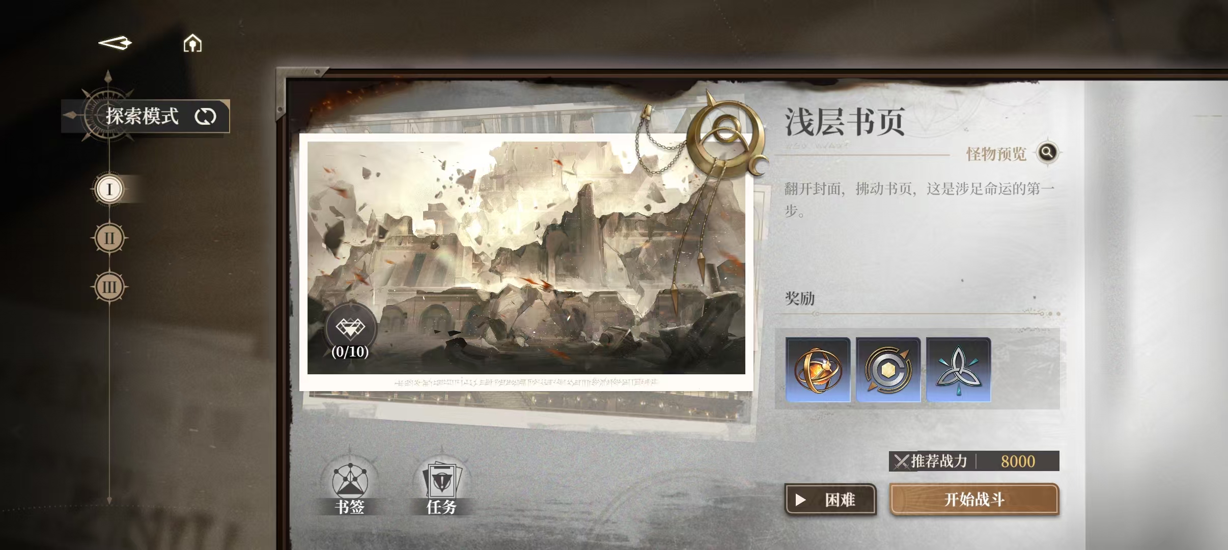 古痕的获取:开始战斗-探索-命运之书中获取,这关卡是肉鸽模式,简单难度通关可以获得货币以及一定数量的一孔古痕,困难难度通关可以获得一定数量的三孔及一孔古痕。(简单和困难模式通关后都需消耗体力领取奖励,掉落的货币数量是一样的,只存在古痕掉落差异)