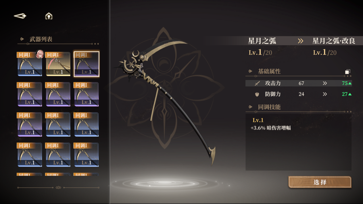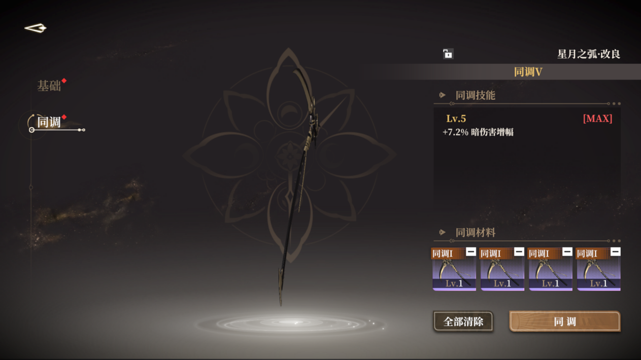 同调则可以理解为武器潜能的提升,即“自己吃自己”。同类武器同稀有度可以加入同调来进行武器的增强,即伊蕾的金色专武碎月之弧就吃碎月之弧,星月之弧吃星月之弧。