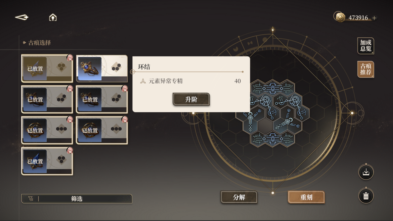 手里的武器有了,身上的装备也必不可少。古痕系统也就是装备系统,与武器的特定属性不同,古痕需要自己选择属性去搭配。如水伤害增幅的古痕就不适用于暗元素的伊蕾什安,其次是看自己想要角色更偏向什么方面,如想增加存活能力可以选生命古痕。