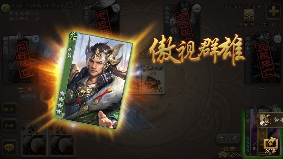 吴景的强度就在于开局能刷到多少杀,而其中红杀的数量更为重要,而就算你开局秒掉一个,整副牌里的红杀你用了多少?怎么去单挑另一个武将?说实话都不用阴间农民,普通农民都够吴景喝一壶的,技能过于单一就会导致短板出现。