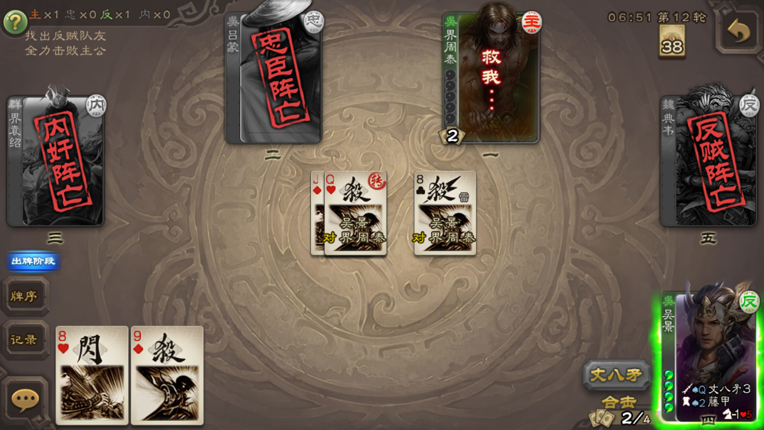 跟着主公上就能吃饱饭,开局可快速压制反贼核心,前提主公会看身份,包养流过牌流主公都能与吴景配合,吴景起手尽量刷红杀就行了,看到杀多就可以了,只有杀这张牌能带动过牌加输出