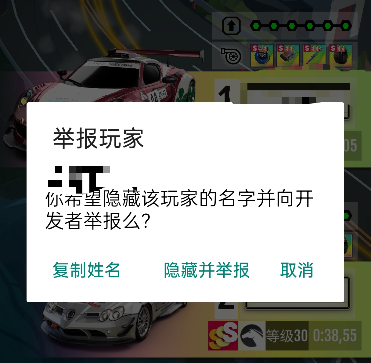 以联赛为案例,我们在进行一场正常的比赛后,在显示成绩页面,长按对手【车牌】3 秒钟,显示如下图片内容,点击举报即可。