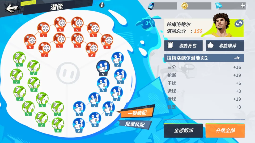 这套潜能主要增强了拉梅洛鲍尔的三分能力,再加上自身有着较高的中投和上篮属性,可以丰富进攻手段,适合持球单打的街球手装配。