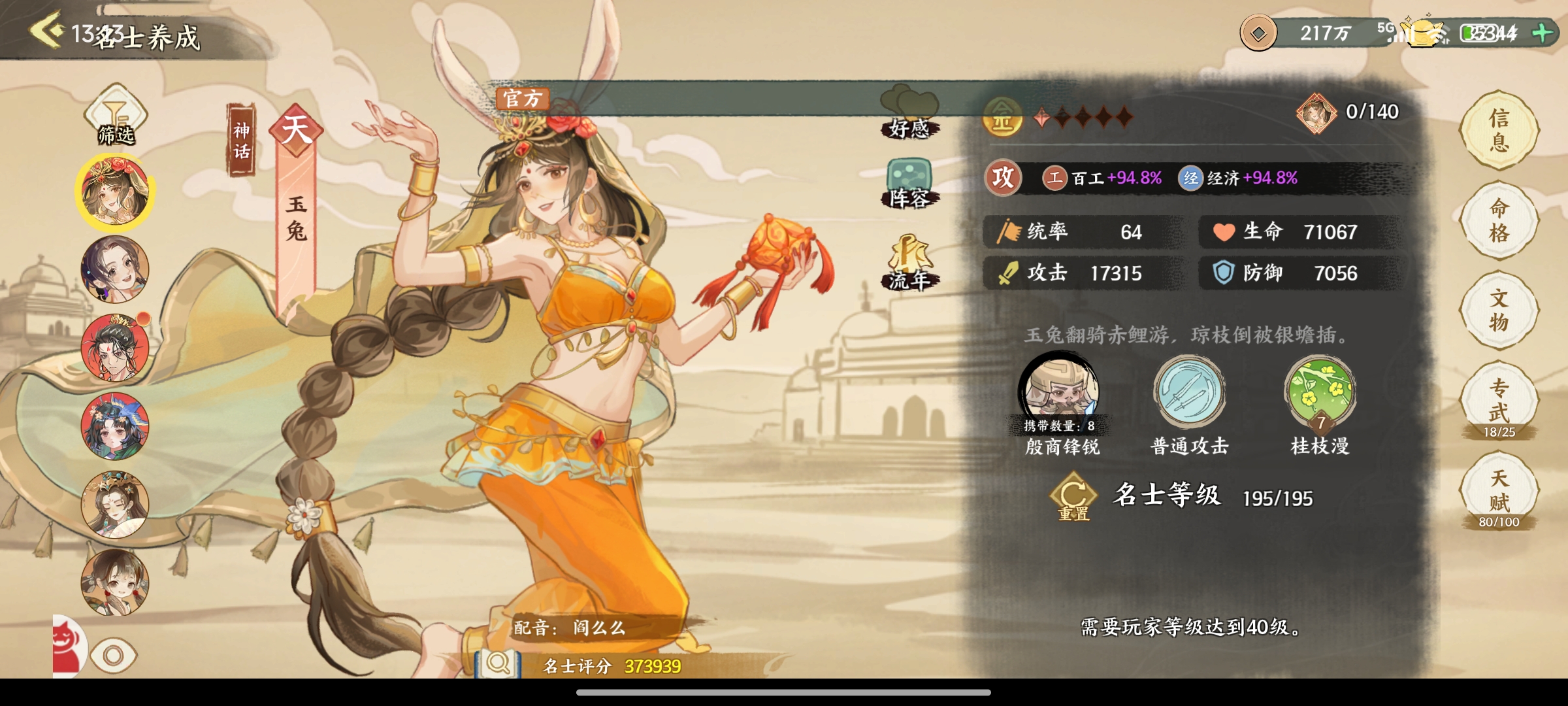 接下来讲金队的天级卡玉兔,这张卡属于五行天级卡里的垫底存在,为什么呢,因为这张卡的机制是第一次开大属于叠自己的buff层数,需要开出第二个大招伤害才比较可观,但是现在pvp和pve的大环境,这个卡基本丢一个大就暴毙了,所以只能当做一个清杂的副c,文物选择可以给她带技能吸血,可能生存环境稍微好一点,现在有些顶级大氪佬的金队都不带这个了,用满星二乔把她换下来了!