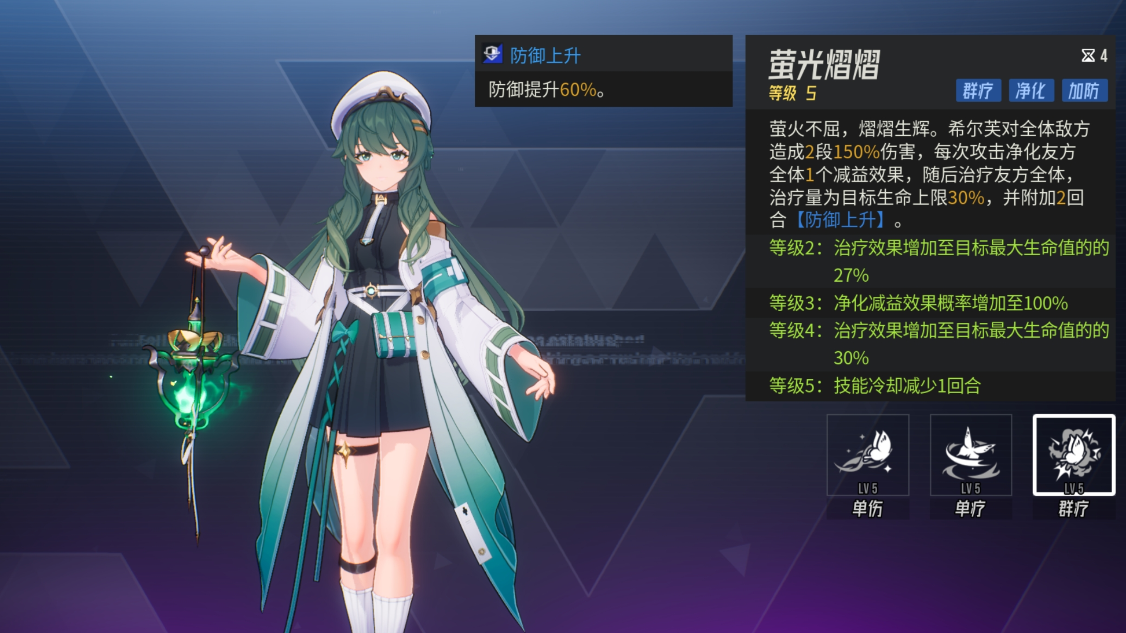 终结技是希尔芙的核心技能,对敌方全体造成多段伤害,每次可净化友方全体的减益效果,然后以目标最大生命进行治疗,并附加两回合防御上升