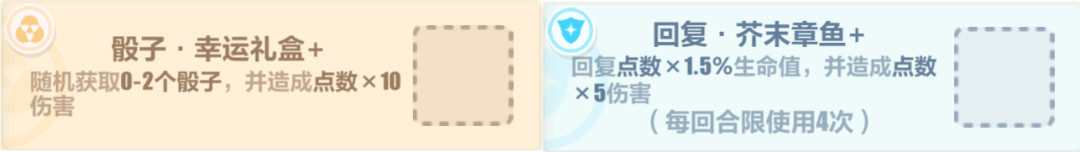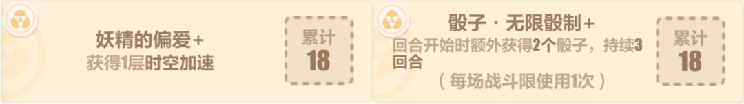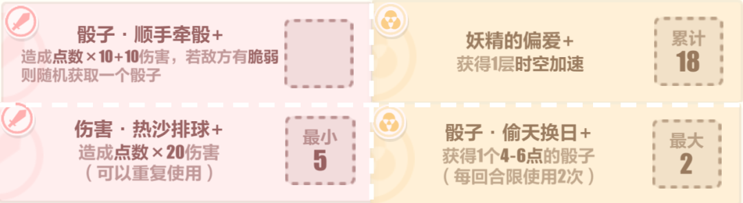 由于帕朵的累计技能触发速度很快,所以可以将“时空加速”作为补强技能。“无限骰子”也是获取骰子的手段之一,但每场战斗只能用一次。